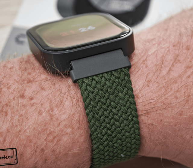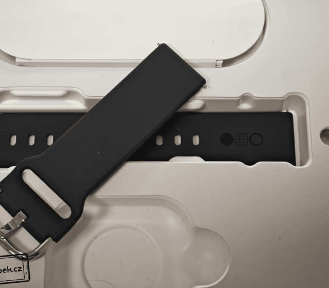Čelní plocha hodinek má OLED displej s úhlopříčkou 1,96palce a jeho ochranné sklo je po stranách mírně zaobleno. Vzhledem k ceně jsem očekával také silikonový řemínek, ale ten jsem okamžitě nahradil vlastním látkovým. Se silikonem si totiž má pokožka nerozumí. Rozhodně je fajn, že hodinky mají možnost připojení jakéhokoliv řemínku s běžnými stěžejkami o rozteči 22 mm.