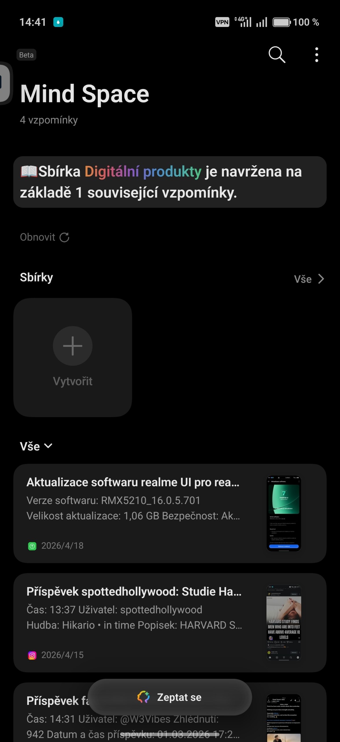 Realme se inspirovalo u již zmíněného londýnského výrobce a přineslo vlastní prostor pro screenshoty a poznámky. Všechny záznamy si můžete třídit do tzv. sbírek. K čemu to je dobré? Můžete si vytvořit screenshot článku v angličtině a LLM model během chvilky vše přeloží do češtiny. Následně máte možnost pokládat modelu dotazy; data pro odpovědi budou sbírána mezi vašimi záznamy, nikoliv z internetu.