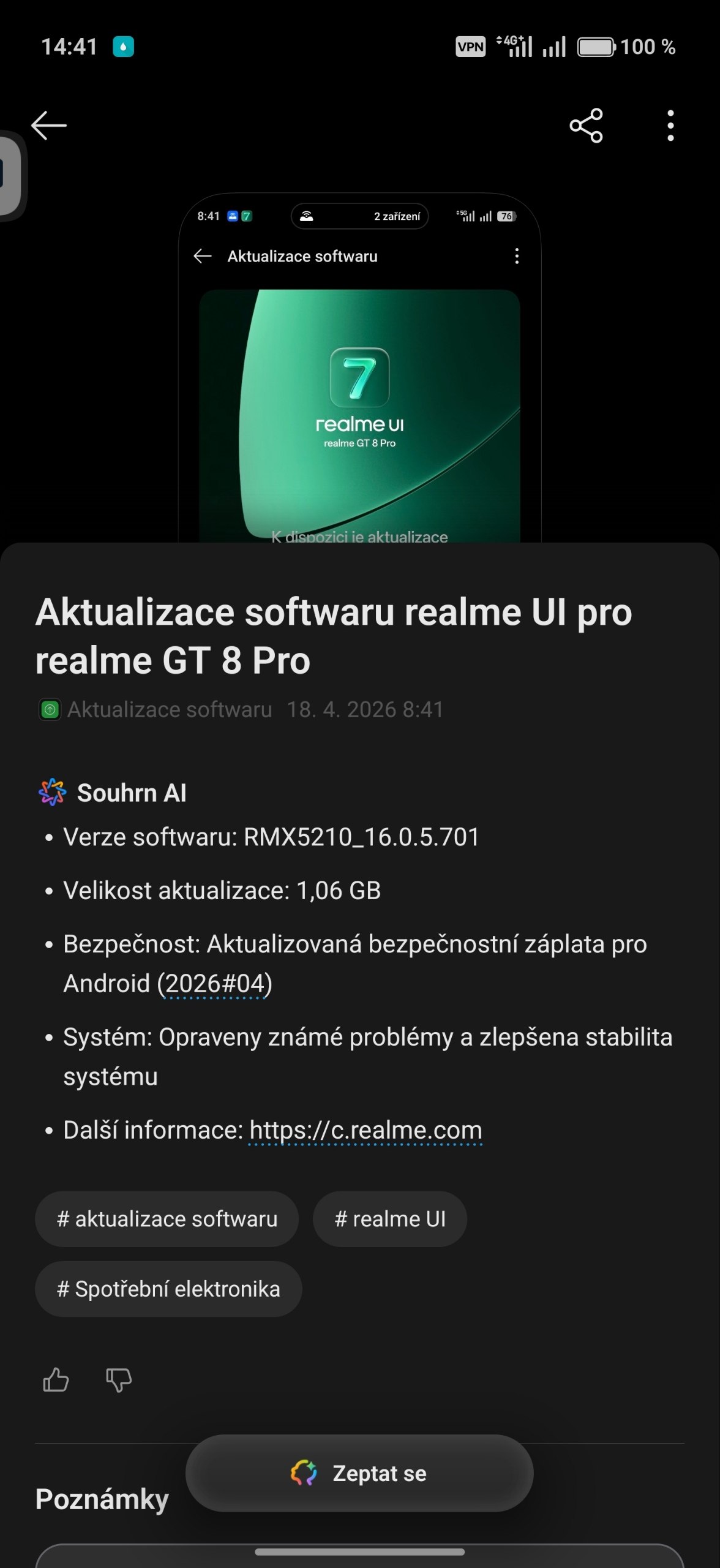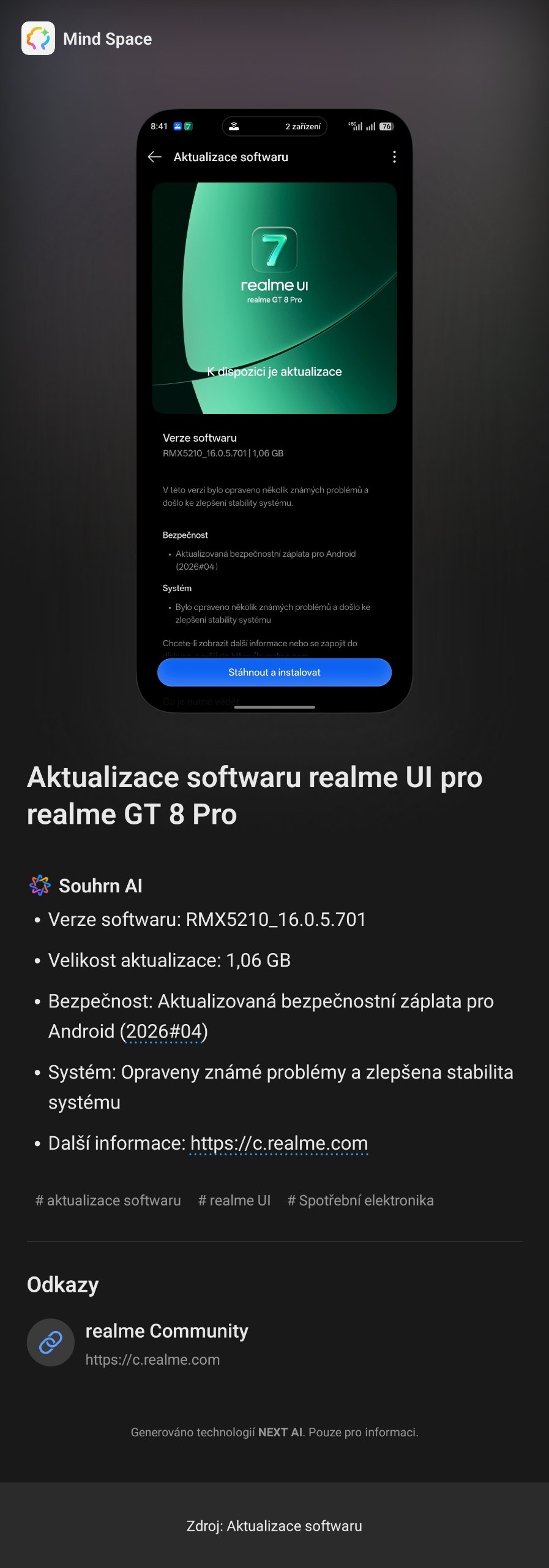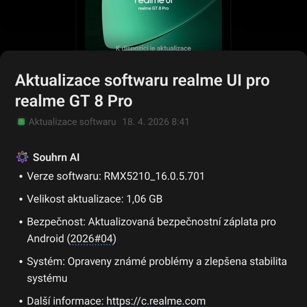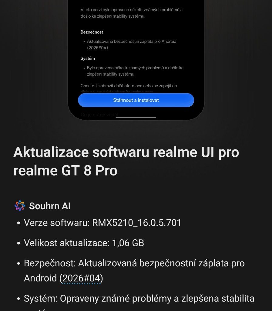 Výrobci mobilních telefonů se v poslední době chlubí moderními AI funkcemi. Mezi nimi je i vlajkový model realme GT 8 Pro. Před pár dny tento model obdržel novou verzi s označením RMX5210_16.0.5.701 a velikostí 1,06 GB, která přináší příjemná zlepšení v oblasti AI. Co ale vlastně vylepšuje?