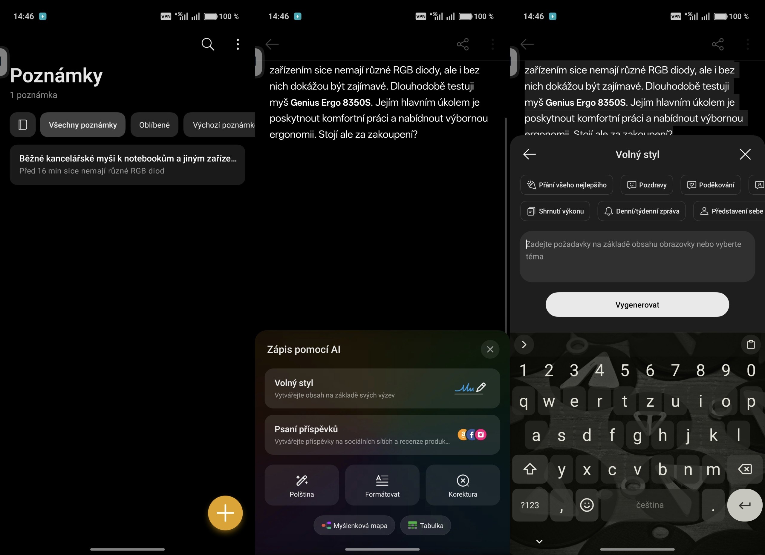 V mobilu se nachází hezká aplikace pro práci s poznámkami. Má pokročilý AI editor, který v předchozí verzi systému měl problémy s češtinou. Občas problém nebyl, ale čas od času si pletl český jazyk se sousedním polským. Chyba je již opravena a například oprava chyb v dlouhém textu funguje dobře. Došlo i ke zvětšení některých ovládacích prvků.
