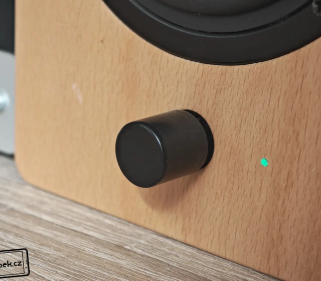 Čelní část nabízí infraport pro používání dálkového ovladače z balení a barevnou diodu. Díky barvám poznáte, zda máte přepnuto na používání gramofonu, Bluetooth atd. Nechybí ani potenciometr pro ovládání hlasitosti otáčením, můžete ho i stisknout a přepínat tak výstupy (bude se měnit i barva diody). Dlouhým stiskem reproduktory vypnete nebo zapnete.