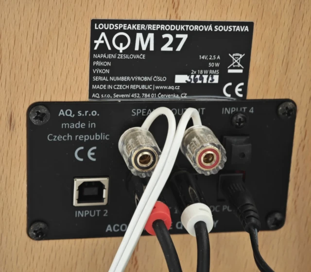 AQ M27 je aktivní reprosoustava vhodná do menších až středně velkých prostor. Vlastně parametry jsou dost podobné již zmíněné starší reprosoustavě AQ M25. I v novém modelu se ukrývá integrovaný zvukový zesilovač třídy D s výkonem 2x 30 W. Ony vlastně i další parametry jsou podobné, ale ve zvuku nejde jen o technologie a specifikace, ale dost dělá i zpracování reprosoustav.