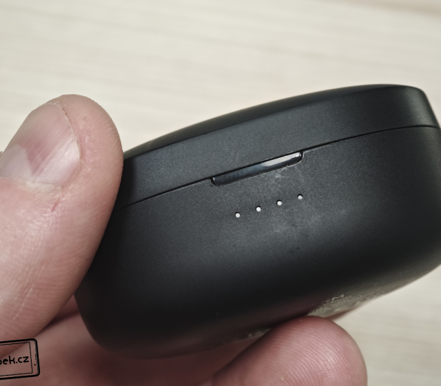 Samotná krabička má oblé tvary a chválím za nasazení čtveřice bílých diod. Ty značí stav nabití krabičky. Není zde tedy jen jedná barevná dioda, podle jejíž barvy musíte odhadovat stav nabití. Zadní část má USB-C konektor pro nabíjení, vespod krabičky jsou popisky výrobce a na horním víku je logo výrobce. Víko nemělo po celou dobu testování žádné tendence se samovolně otevírat při přenášení v batohu nebo volnějších kapsách. Sluchátka mají v krabičce dostatek místa a jejich vyjímání je snadné.
