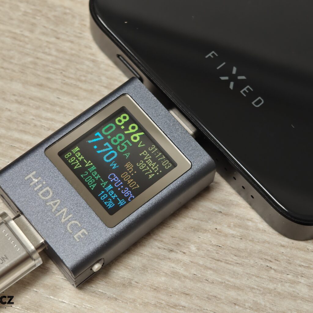 Po připojení kabelu do USB-C a mobilu dojde k automatickému přepnutí na kabelové připojení. USB-C konektor podporuje velmi rozšířený standard Power Delivery a výrobce udává maximální výkon výstupu 20 W pro nabíjení zařízení. Vzhledem k velikosti powerbanky je to dost, protože často i tlustší powerbanky poskytují 10–15 W výkon. Během testování jsem nejčastěji naměřil výkon nabíjení zařízení 18,6 W, ale skočila i hodnota 19 W. Výrobce tedy s výkonem nelže a číslo 20 W nemusí být dosaženo kvůli ztrátám, jak jsem již zmínil. Samotná powerbanka se nabíjí výkonem 18 W, což potvrdilo i měření.