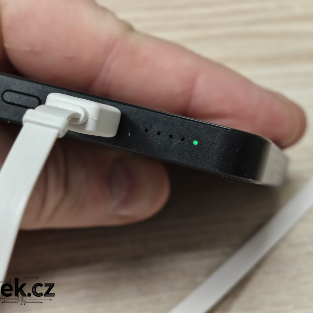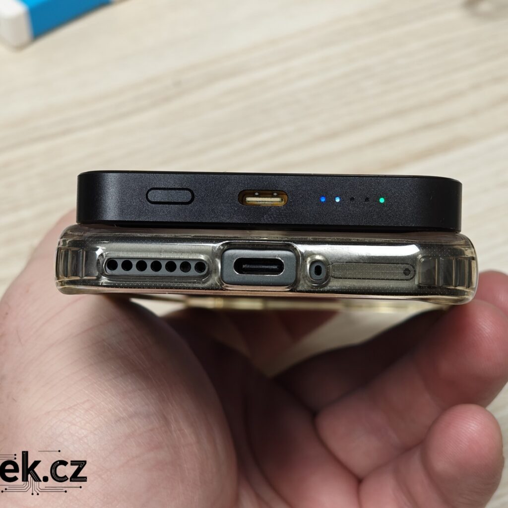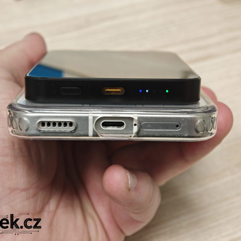 Powerbanka láká na nový standard bezdrátového nabíjení Qi2, ale je zpětně kompatibilní s mobily se starší verzí Qi. Bezdrátové nabíjení probíhalo dobře a stačilo jen powerbanku připnout na mobil nebo na ni položit bezdrátová sluchátka. Pokud powerbanku budete nabíjet, můžete ji mít připnutou na mobilu a zároveň ho nabíjet. Já používal bezdrátové nabíjení především pro nabíjení různých bezdrátových sluchátek, což powerbanka taktéž plnila výborně. Podporovány jsou rychlosti bezdrátového nabíjení: 5 W, 7,5 W, 10 W a 15 W. Co se zařízení s Androidem týká, naměřil jsem hodnotu 14,2 W, takže maximální výkon udávaný výrobcem souhlasí. Uživatelé iPhonů se však budou muset spokojit s výkonem 7,5 W, jak je ve světě Applu běžné.