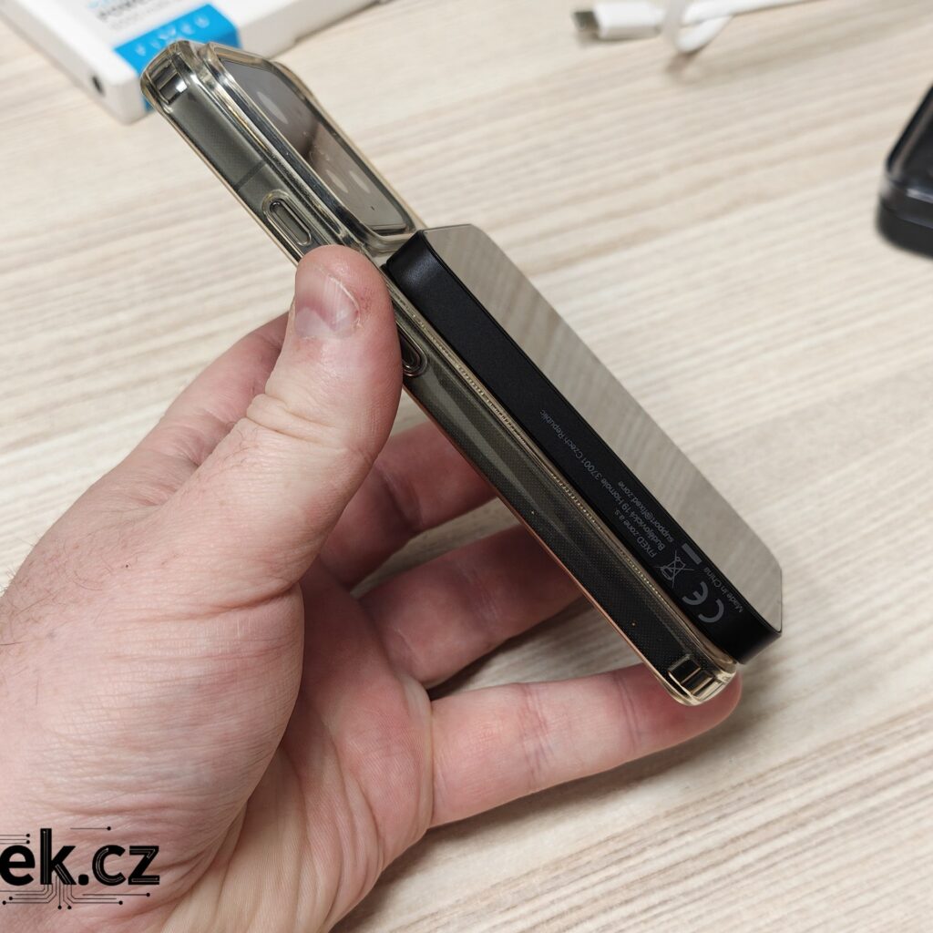 Na testování této powerbanky jsem se těšil, protože už v produktových materiálech působila velmi luxusně. Vyžádal jsem si menší model, protože výrobce slibuje tenké tělo a powerbanka je vhodná pro nabíjení mobilu třeba i v kapse. Podle údajů výrobce má rozměry 100 × 68 × 9,4 mm. Je opravdu tenká, a navíc i poměrně lehká – její hmotnost činí jen 141 gramů. Během testování jsem ji běžně nosil magneticky přichycenou k mobilům Xiaomi 15 a Nothing Phone (3). V případě Xiaomi jsem používal ochranný kryt FIXED s integrovaným magnetickým kroužkem, u Nothingu kryt od jiného výrobce.