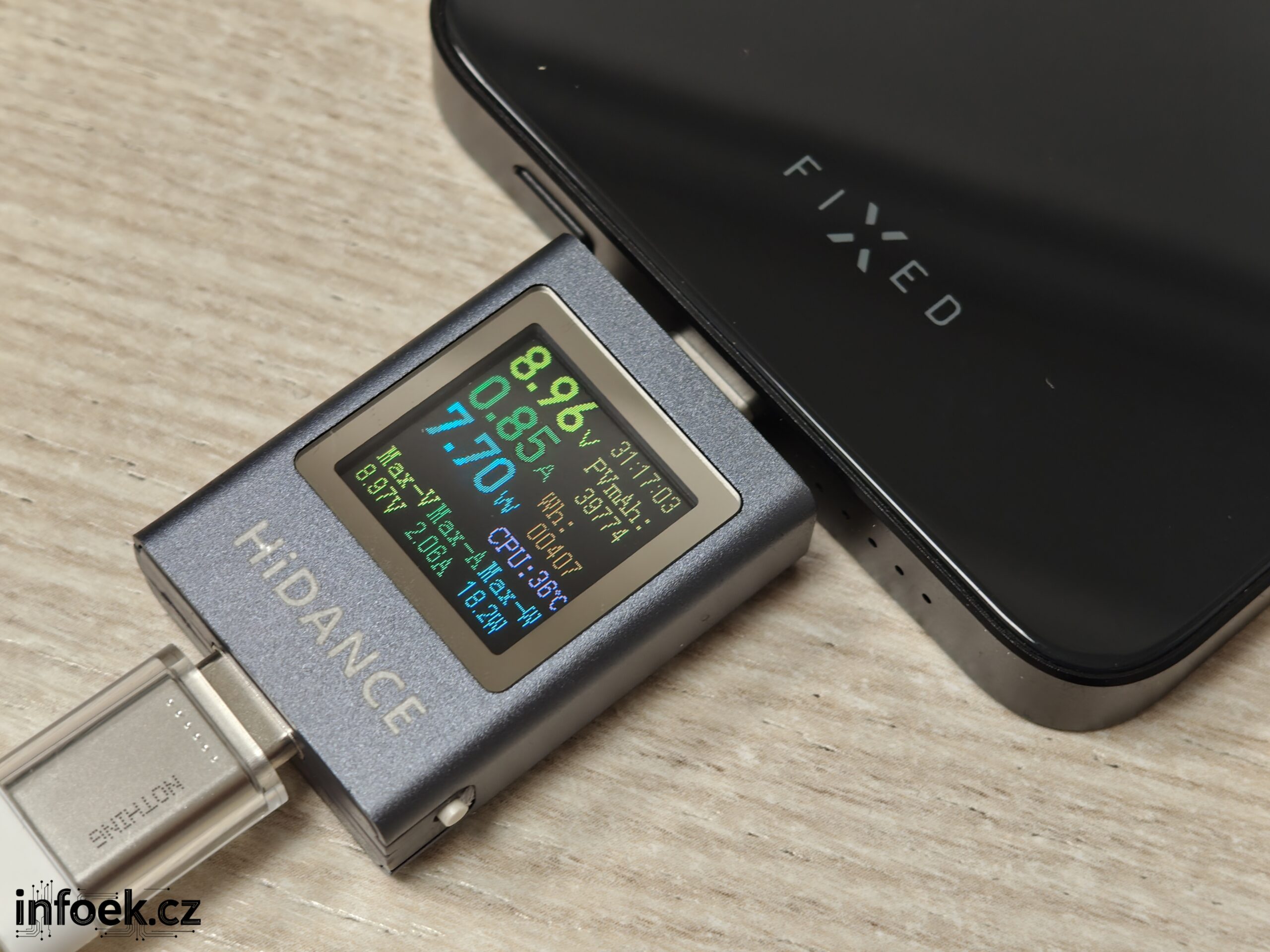 Po připojení kabelu do USB-C a mobilu dojde k automatickému přepnutí na kabelové připojení. USB-C konektor podporuje velmi rozšířený standard Power Delivery a výrobce udává maximální výkon výstupu 20 W pro nabíjení zařízení. Vzhledem k velikosti powerbanky je to dost, protože často i tlustší powerbanky poskytují 10–15 W výkon. Během testování jsem nejčastěji naměřil výkon nabíjení zařízení 18,6 W, ale skočila i hodnota 19 W. Výrobce tedy s výkonem nelže a číslo 20 W nemusí být dosaženo kvůli ztrátám, jak jsem již zmínil. Samotná powerbanka se nabíjí výkonem 18 W, což potvrdilo i měření.