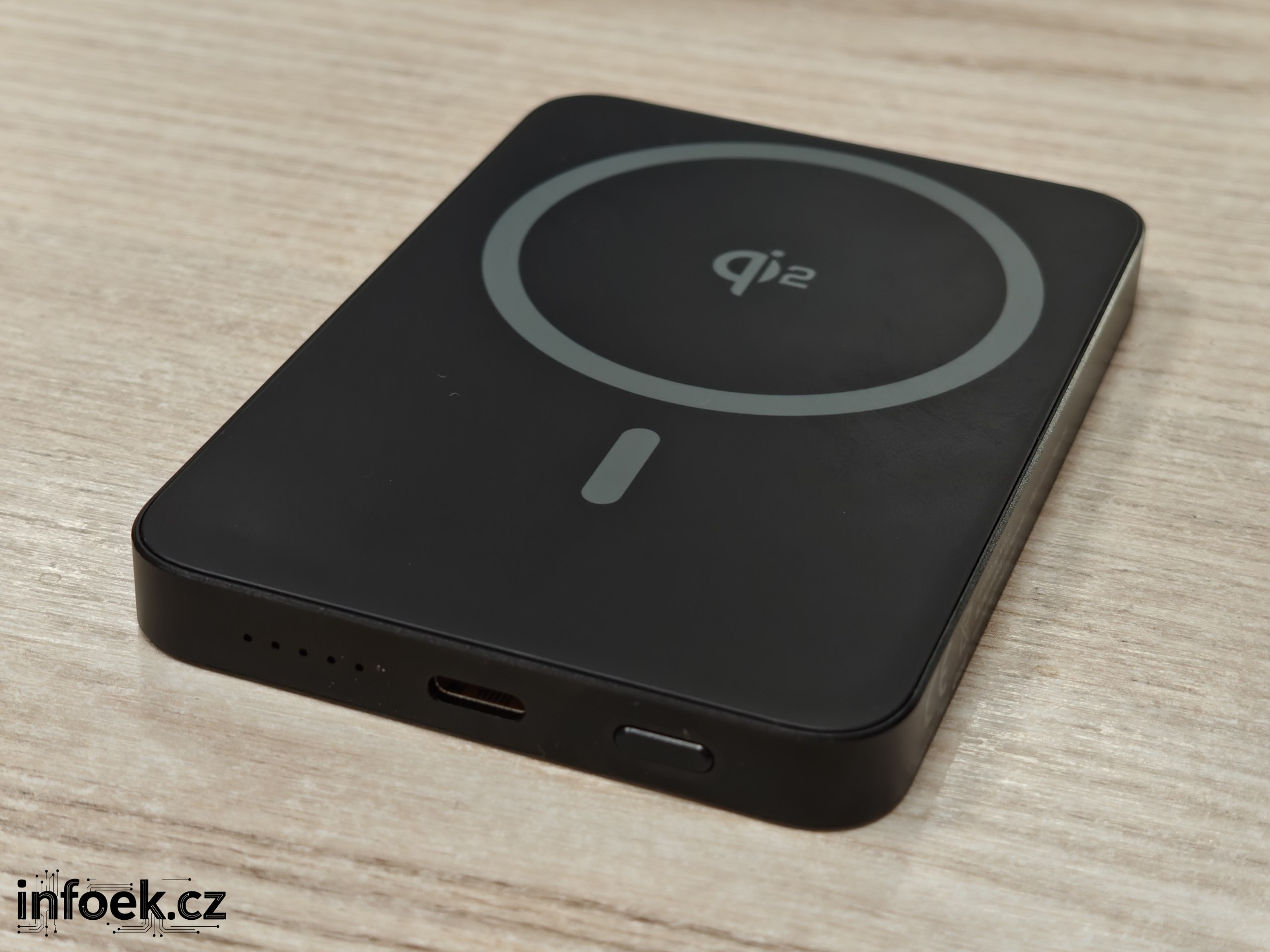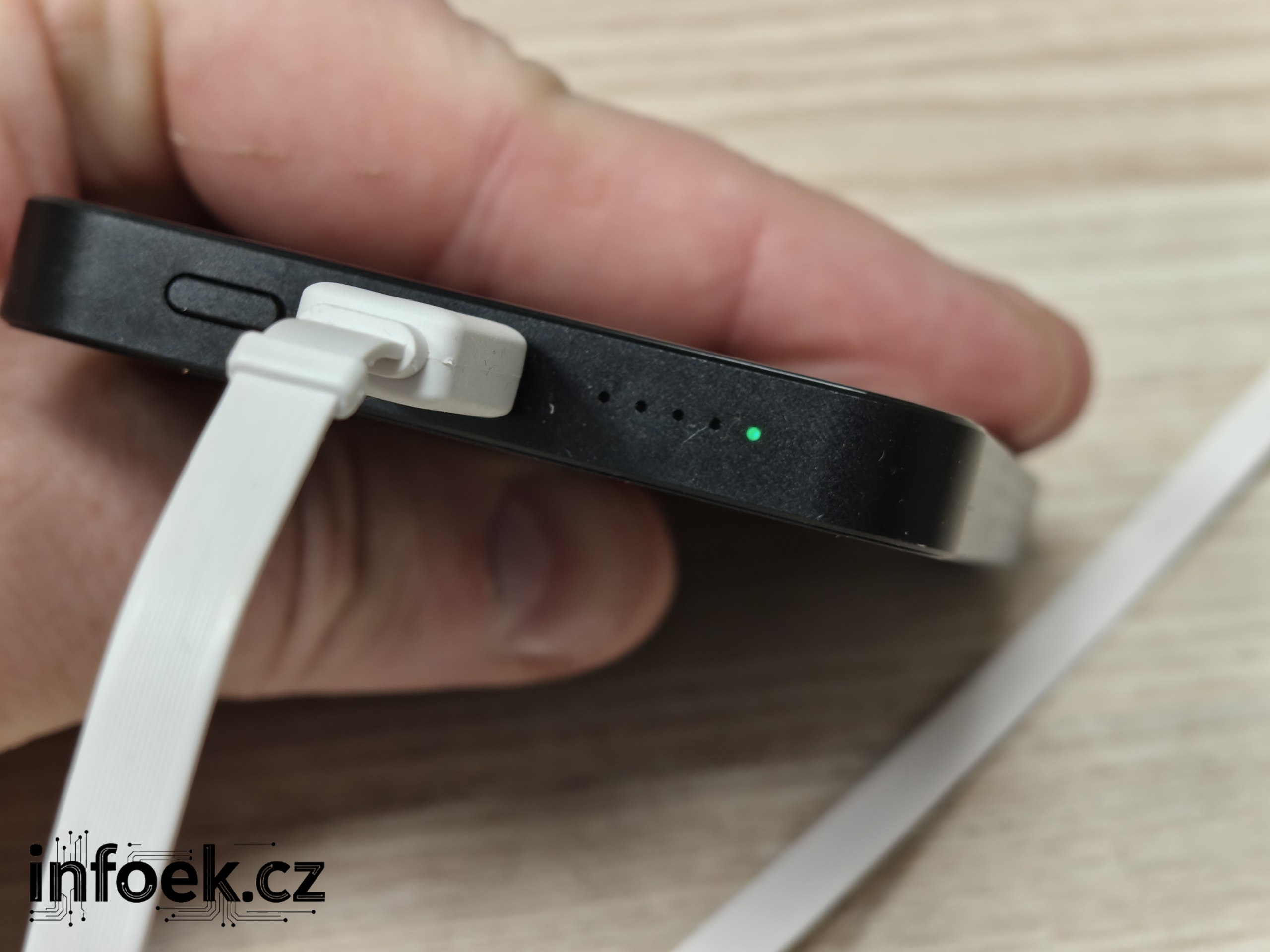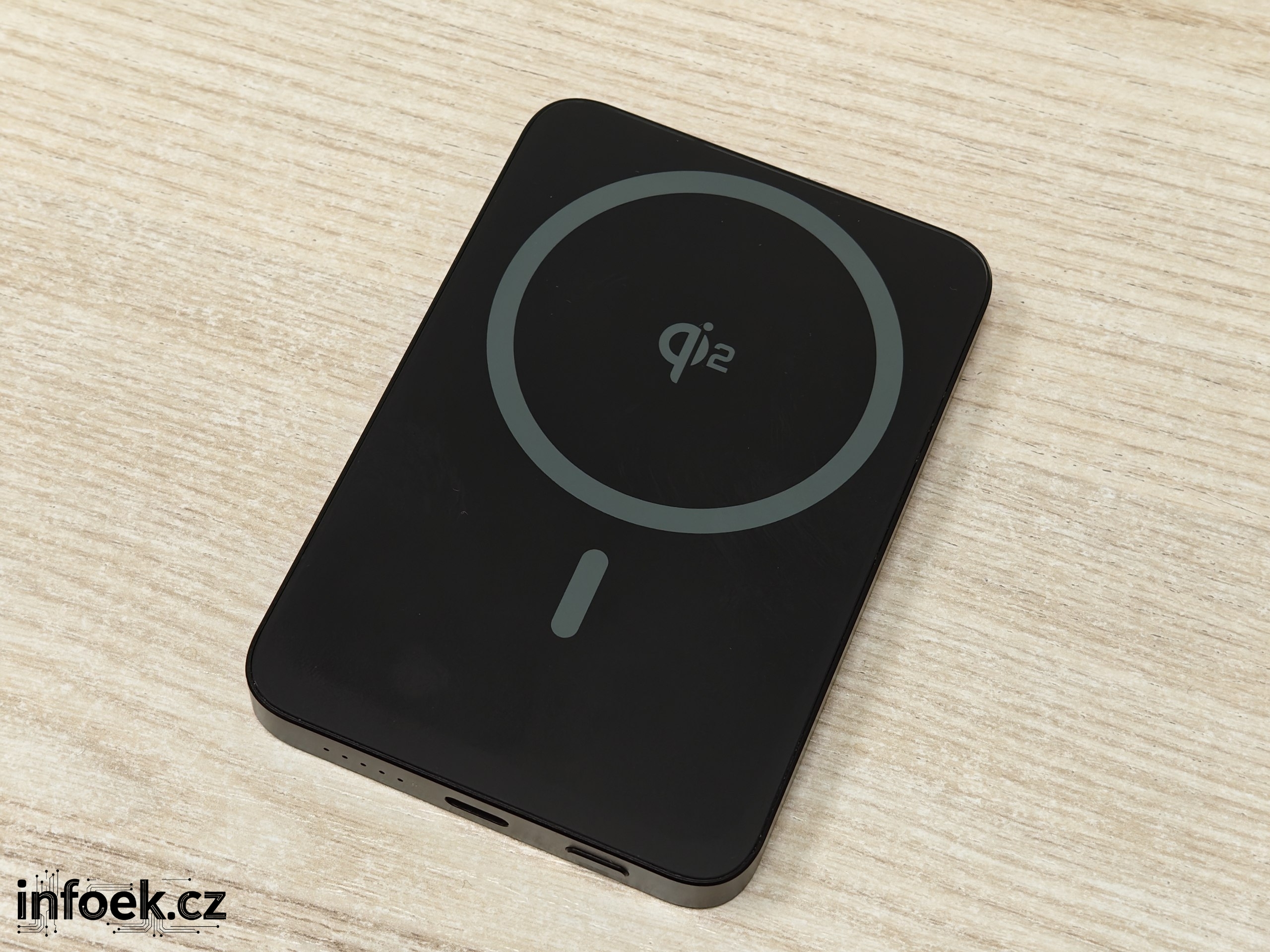 Powerbanka láká na nový standard bezdrátového nabíjení Qi2, ale je zpětně kompatibilní s mobily se starší verzí Qi. Bezdrátové nabíjení probíhalo dobře a stačilo jen powerbanku připnout na mobil nebo na ni položit bezdrátová sluchátka. Pokud powerbanku budete nabíjet, můžete ji mít připnutou na mobilu a zároveň ho nabíjet. Já používal bezdrátové nabíjení především pro nabíjení různých bezdrátových sluchátek, což powerbanka taktéž plnila výborně. Podporovány jsou rychlosti bezdrátového nabíjení: 5 W, 7,5 W, 10 W a 15 W. Co se zařízení s Androidem týká, naměřil jsem hodnotu 14,2 W, takže maximální výkon udávaný výrobcem souhlasí. Uživatelé iPhonů se však budou muset spokojit s výkonem 7,5 W, jak je ve světě Applu běžné.