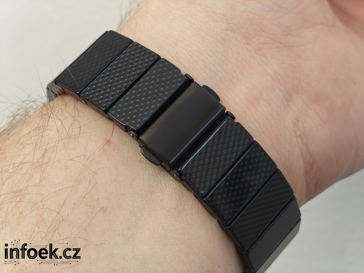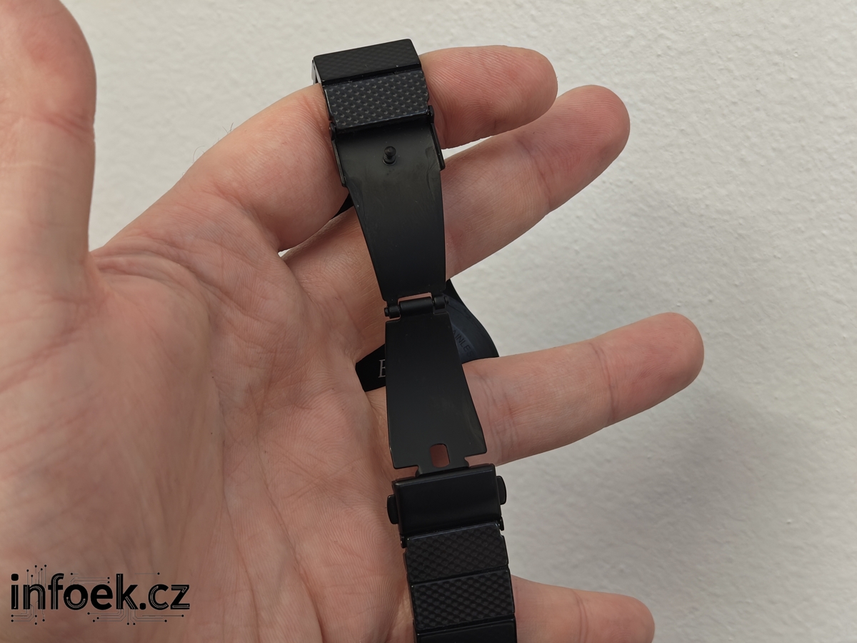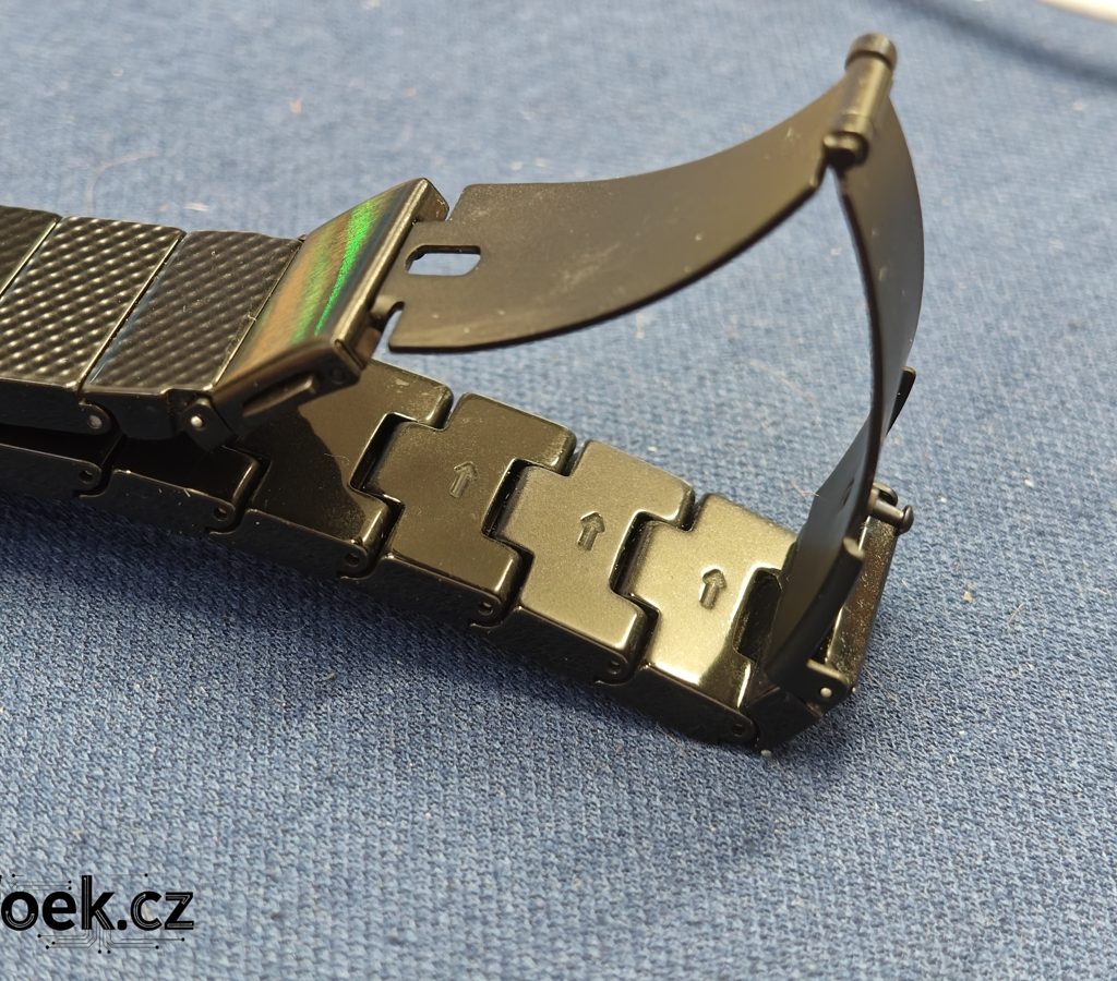 Na ruku sedne řemínek pravděpodobně každému. V prodejním balení totiž najdete nástroj pro snadnou úpravu velikosti. Výrobce chválím za další část pro prodloužení, kterou jsem musel využít, a řemínek je vhodný pro obvod zápěstí do 22,7 cm. Nástroj pro úpravu velikosti najdete v balení taktéž, což se týká samozřejmě i dvojice nerezových stěžejek. Díky šipkám z vnější části bude každému jasné, jakým směrem postupovat během úpravy velikosti.