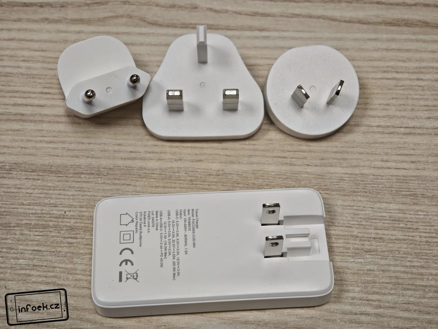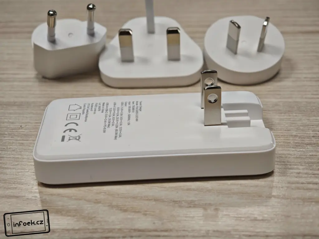 Koupit si můžete více verzí adaptéru. Na první pohled vypadají stejně, ale liší se v nabídce konektorů, nabíjecím výkonem a mnou testovaná vyšší verze je vhodná na cestování do zahraničí. Již v konstrukci adaptérů jsou integrovány kolíky pro zásuvky v USA a z prodejního balení můžete snadno zacvaknutím ještě koncovku pro zásvuky v EU, Británii a Austrálii. Výměna koncovek je velmi snadná a jedná se o elegantní řešení.