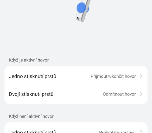 - Jedno klepnutí – přehrávání/pozastavení, přijetí a ukončení hovoru