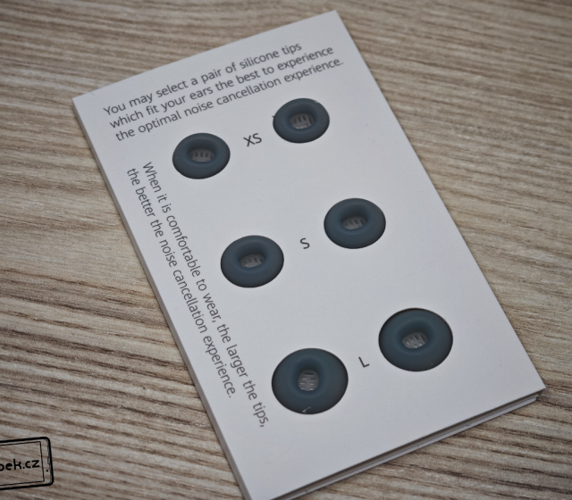 V prodejní krabičce ke sluchátkům dostanete tři velikosti špuntů. K dispozici je i krátký nabíjecí USB-A na USB-C kabel a různé návody.