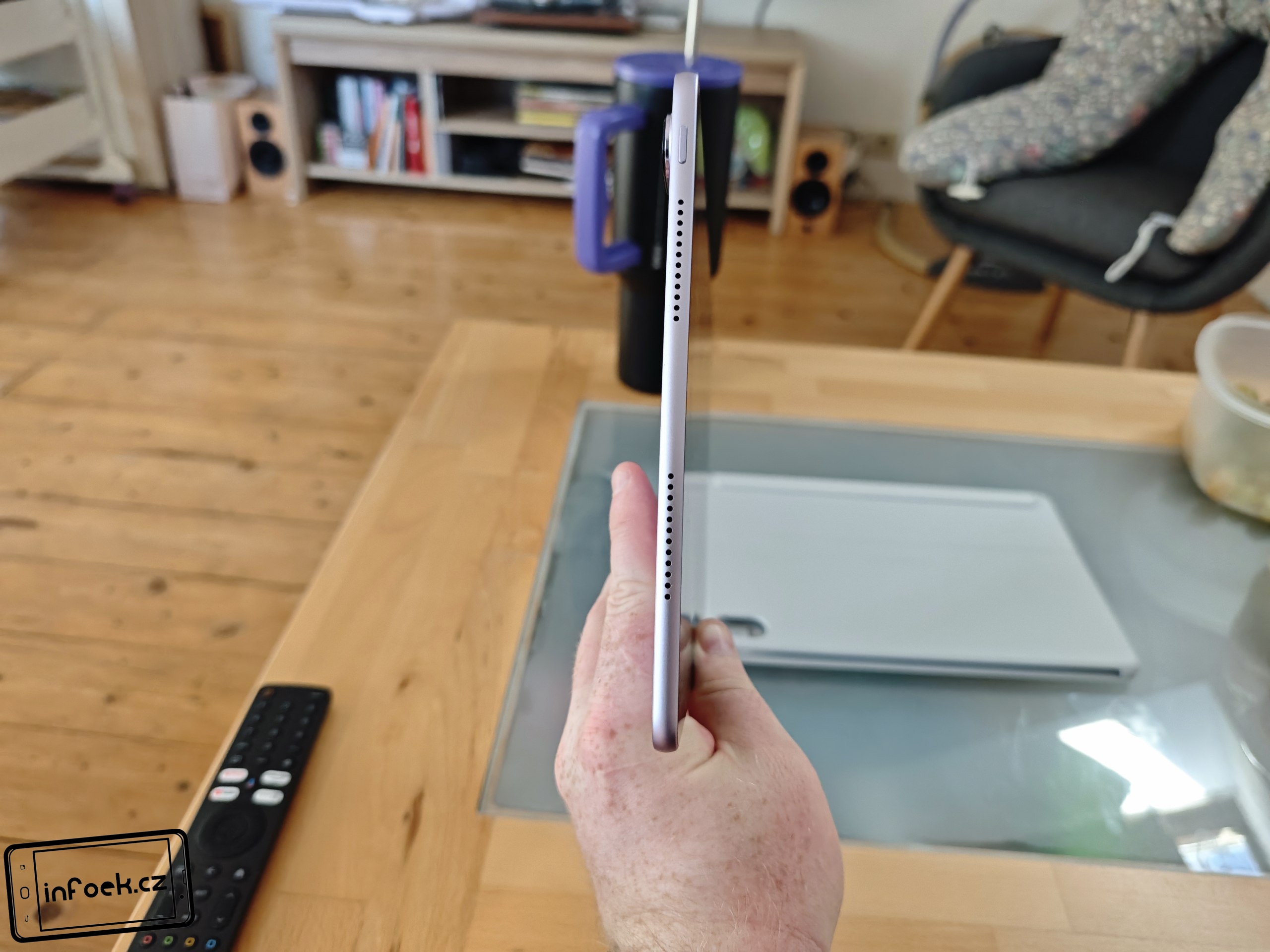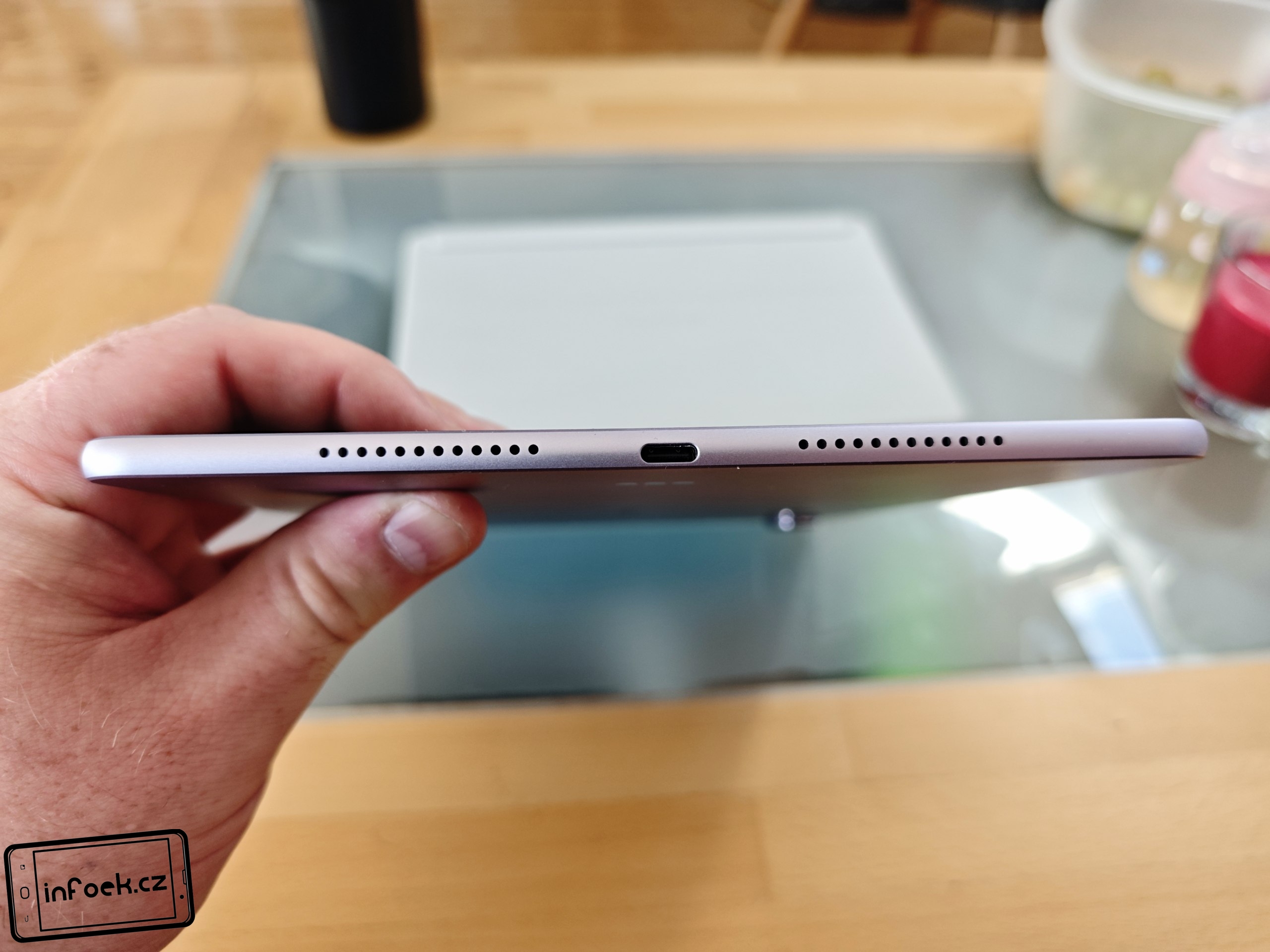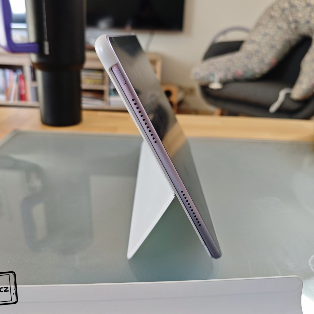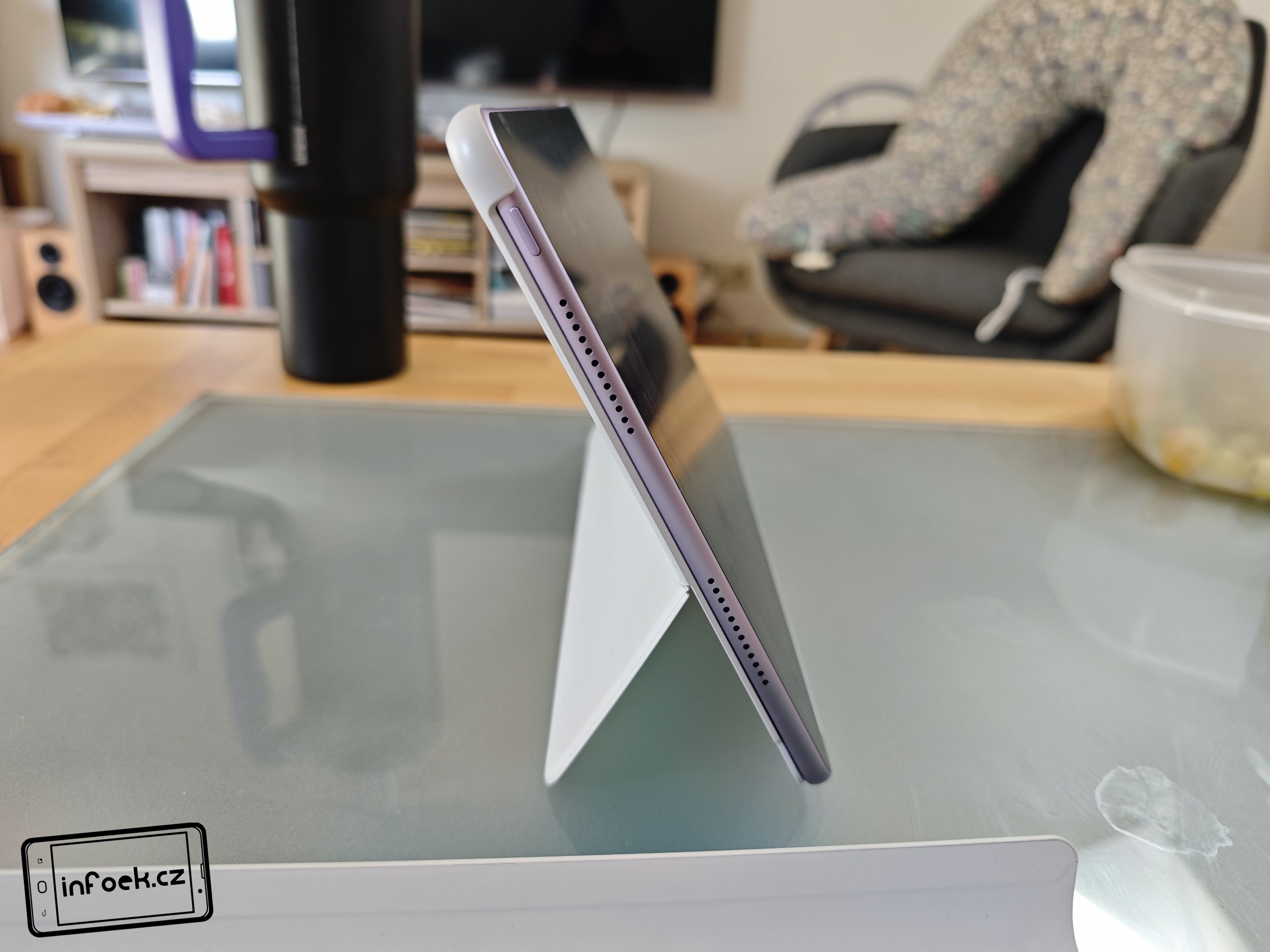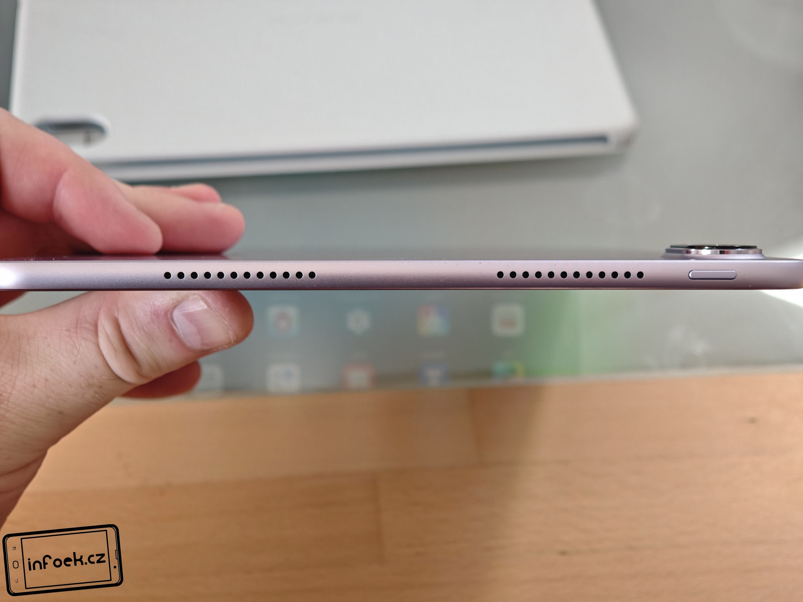 Testovaný kus jsem měl ve fialovém provedení. Barva není nijak výrazná – spíše jemný nádech fialové, který působí elegantně. Pokud nejste fanoušky tohoto odstínu, k dispozici je také varianta ve vesmírně šedé barvě. Obě verze jsou krásné tenké a celkově rozměry činí: 177,53 x 262,63 x 6,1 mm a váží jen 515 gramů.