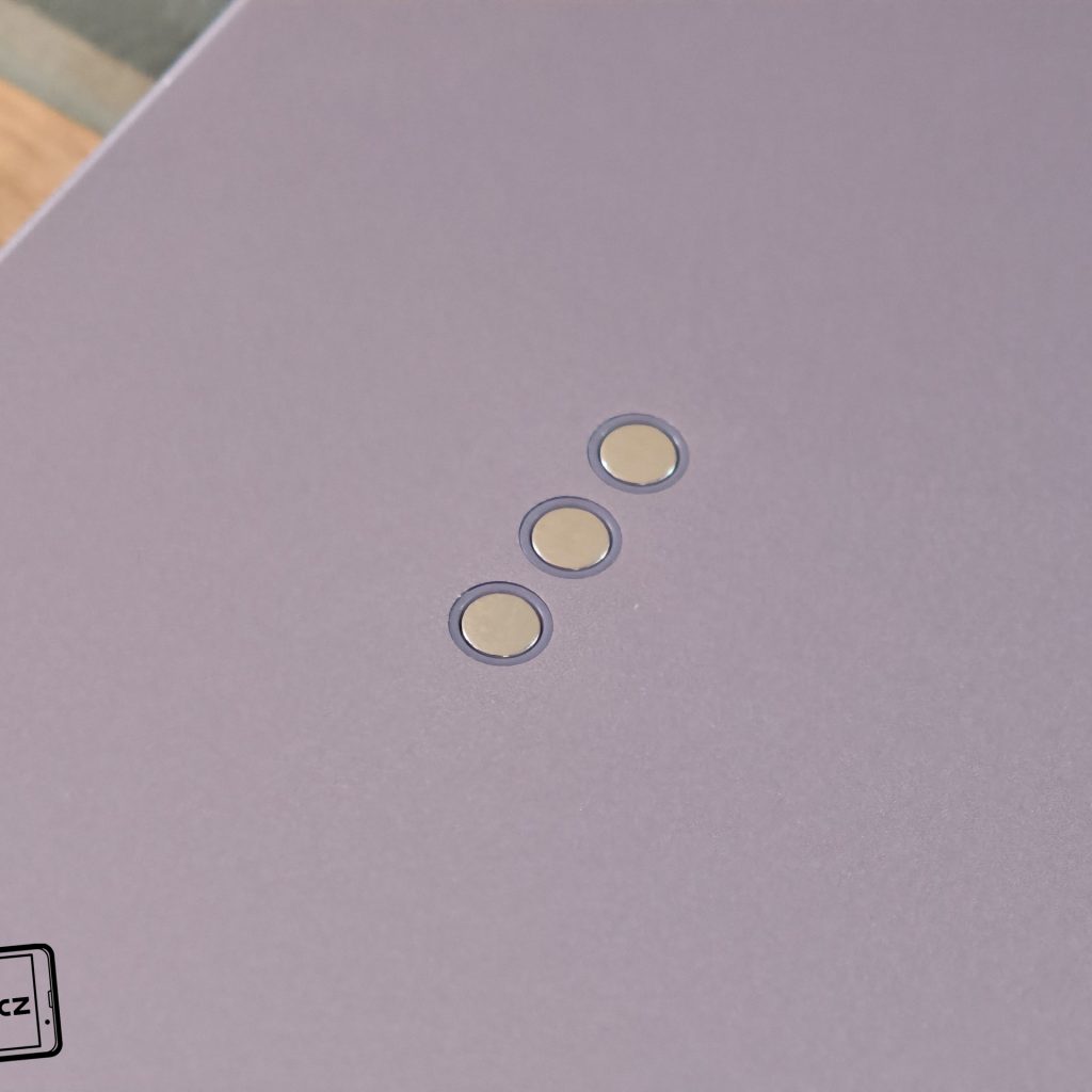 Zadní strana tabletu je rovněž hliníková, zdobí ji logo výrobce a trojice pinů určená pro připojení klávesnice. V horním rohu pak najdete mírně vystupující 13 MPx fotoaparát. Jeho hrany jsou zkosené, aby modul při používání nepůsobil rušivě a neškrábal do ruky.
