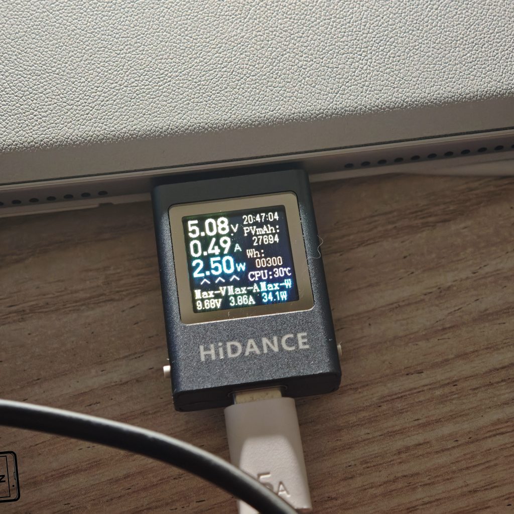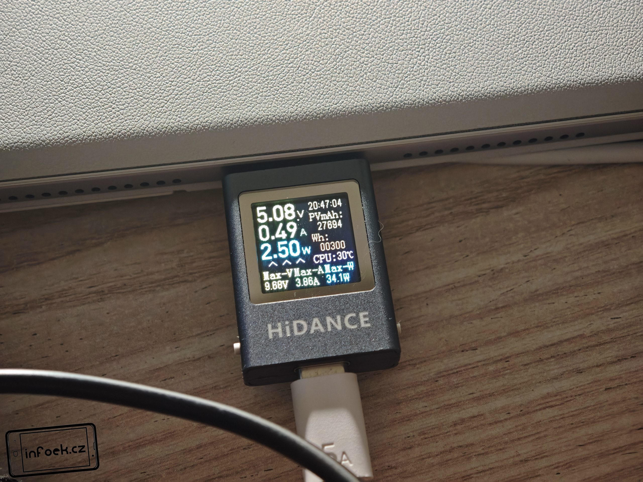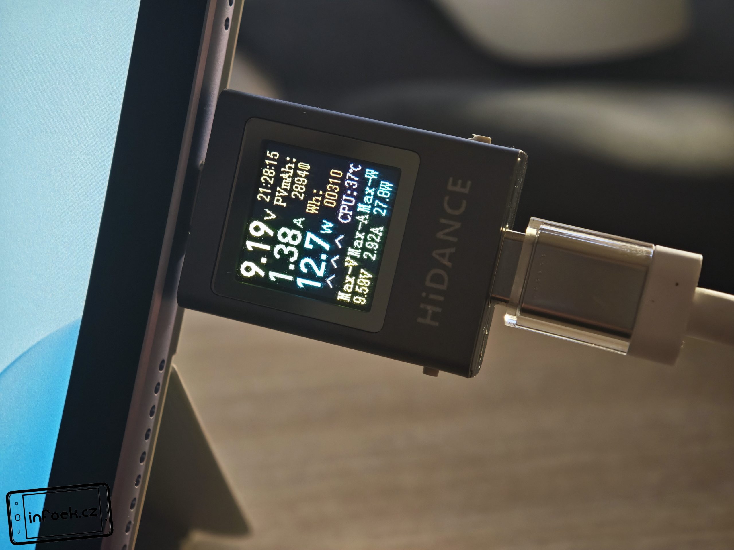 Nabíjení je rychlé – s originálním adaptérem se tablet nabije za přibližně 1 hodinu a 37 minut. Během nabíjení dochází k určitým ztrátám a s originálním adaptérem Huawei jsem naměřil maximální výkon 34,1 W. S použitím adaptéru FIXED 65 W s podporou Power Delivery 3.0 byl maximální výkon 28 W.