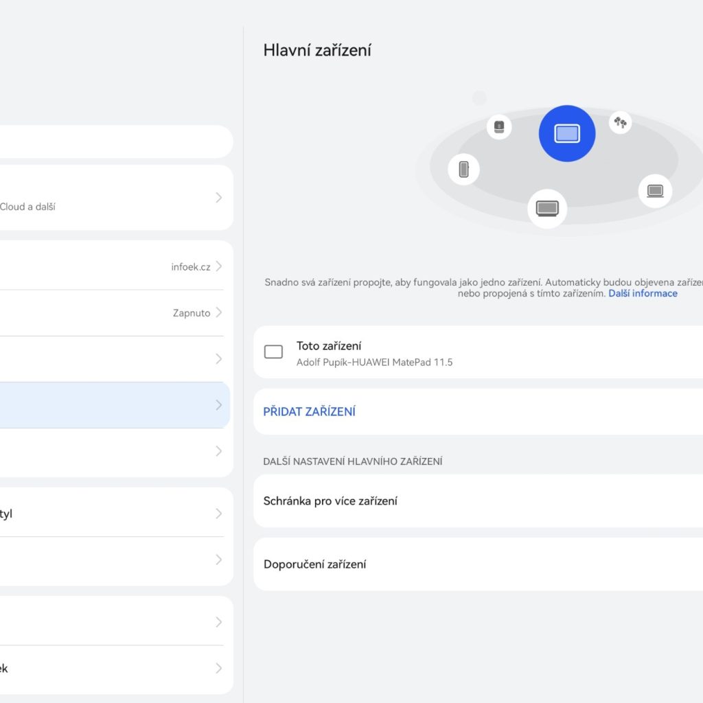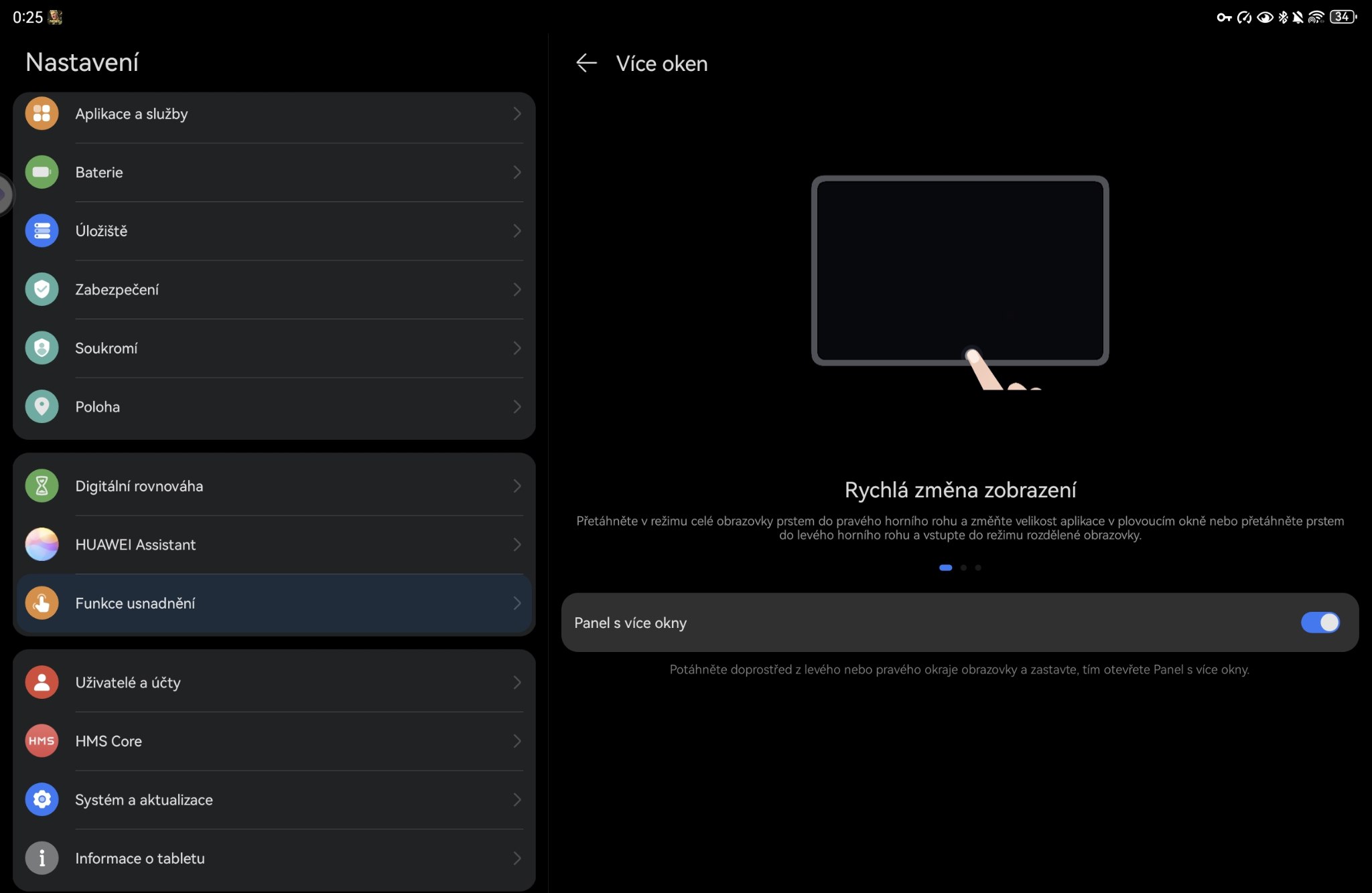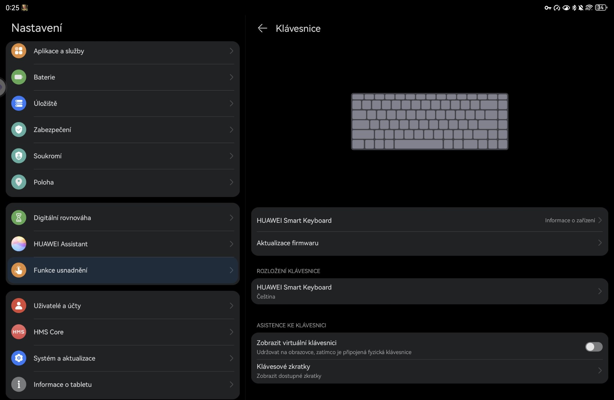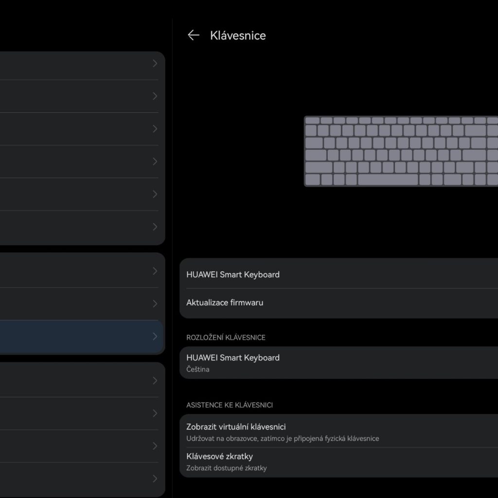 Některé funkce pro efektivnější práci si navíc můžete sami přizpůsobit. Stačí přejít do Nastavení/Funkce usnadnění. Zde lze nastavit ovládací gesta, práci s více okny, funkci SuperHub pro odkládání nejen aplikací do bočního panelu, ovládání dotykového pera, externí myši nebo klávesnice. Po prvním spuštění tabletu doporučuji připojit zařízení k Wi‑Fi a provést aktualizaci nejen systému, ale i firmwaru klávesnice a pera. Dále doporučuji otevřít nabídku „Rozložení klávesnice“ a nastavit možnost „České“.