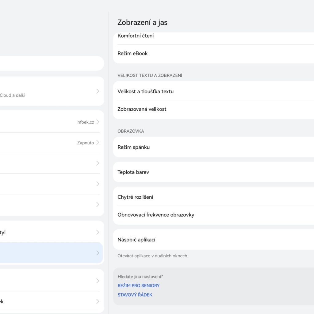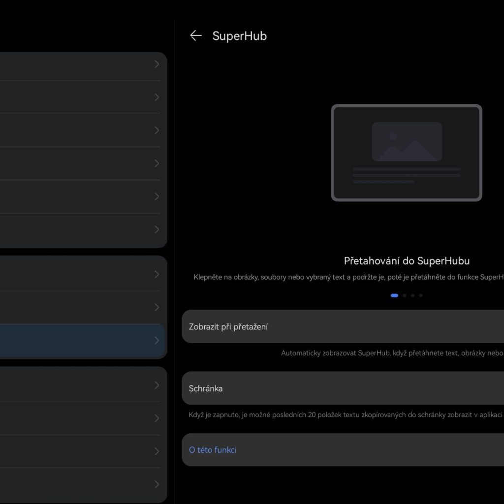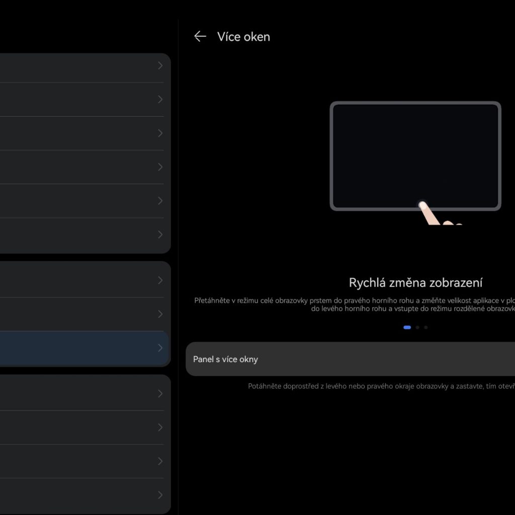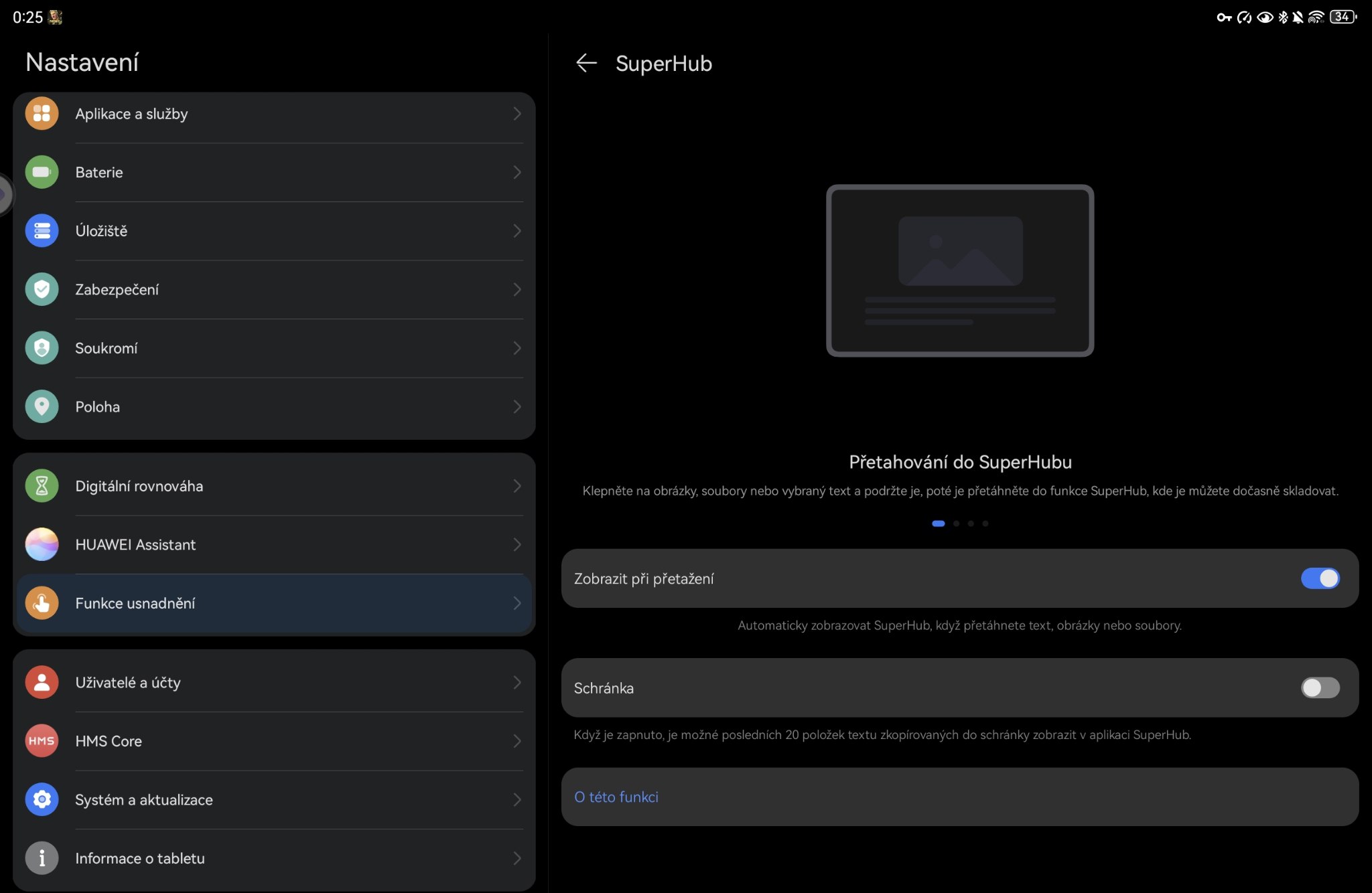 Některé funkce pro efektivnější práci si navíc můžete sami přizpůsobit. Stačí přejít do Nastavení/Funkce usnadnění. Zde lze nastavit ovládací gesta, práci s více okny, funkci SuperHub pro odkládání nejen aplikací do bočního panelu, ovládání dotykového pera, externí myši nebo klávesnice. Po prvním spuštění tabletu doporučuji připojit zařízení k Wi‑Fi a provést aktualizaci nejen systému, ale i firmwaru klávesnice a pera. Dále doporučuji otevřít nabídku „Rozložení klávesnice“ a nastavit možnost „České“.
