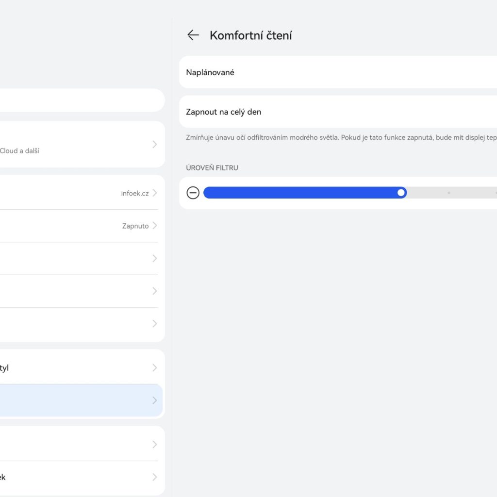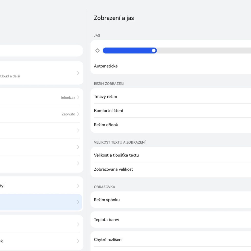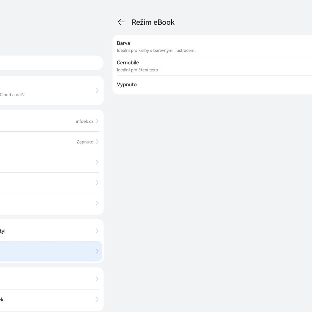 Další výhodou „papírového“ displeje je pohodlnější čtení článků či knih. V nastavení nebo přímo v rychlé liště lze zapnout režim eBook, který upraví barevné podání pro lepší čitelnost v noci, případně přepne obraz do černobílé podoby, aby se více podobal klasickému papíru. Já osobně tuto funkci používám rád, i když hlavně pro čtení textů na internetu.