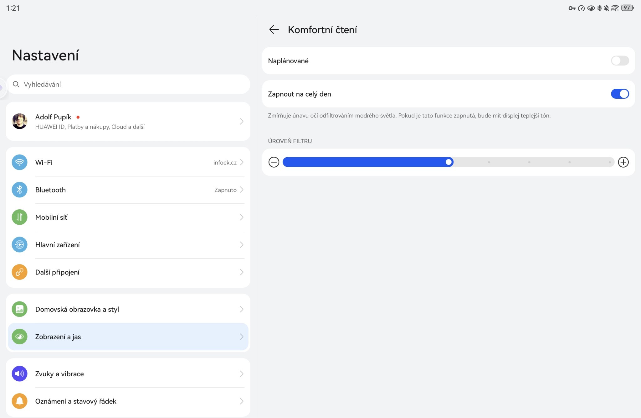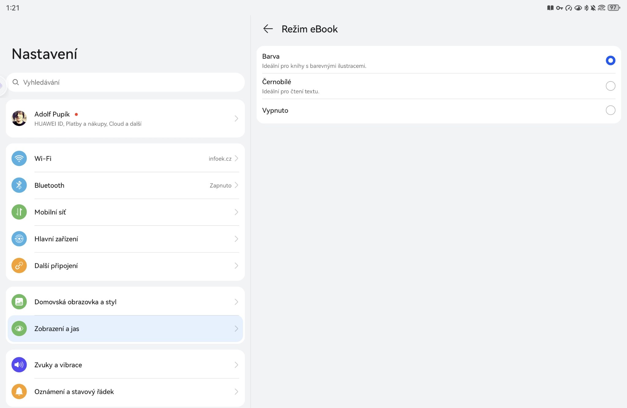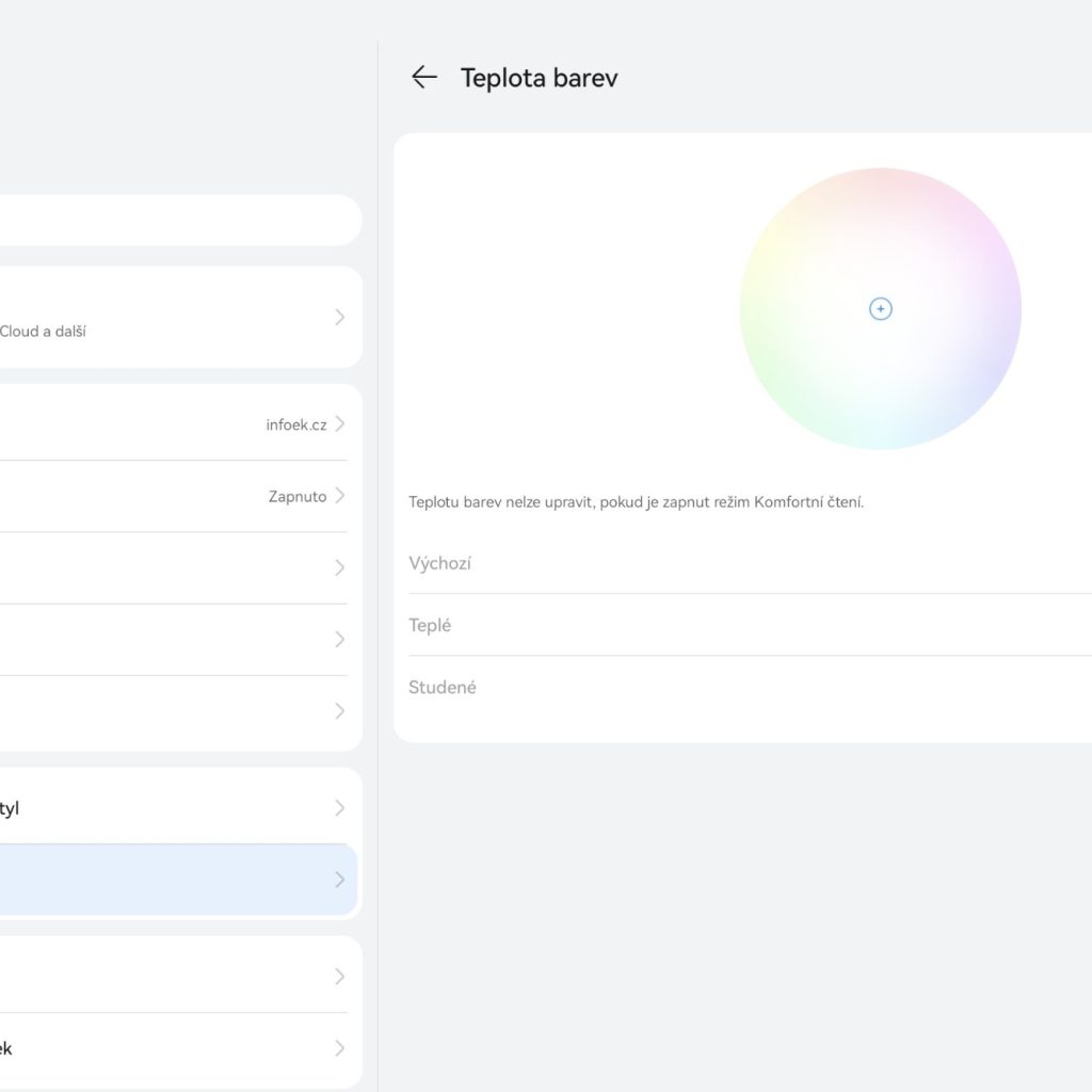 Další výhodou „papírového“ displeje je pohodlnější čtení článků či knih. V nastavení nebo přímo v rychlé liště lze zapnout režim eBook, který upraví barevné podání pro lepší čitelnost v noci, případně přepne obraz do černobílé podoby, aby se více podobal klasickému papíru. Já osobně tuto funkci používám rád, i když hlavně pro čtení textů na internetu.