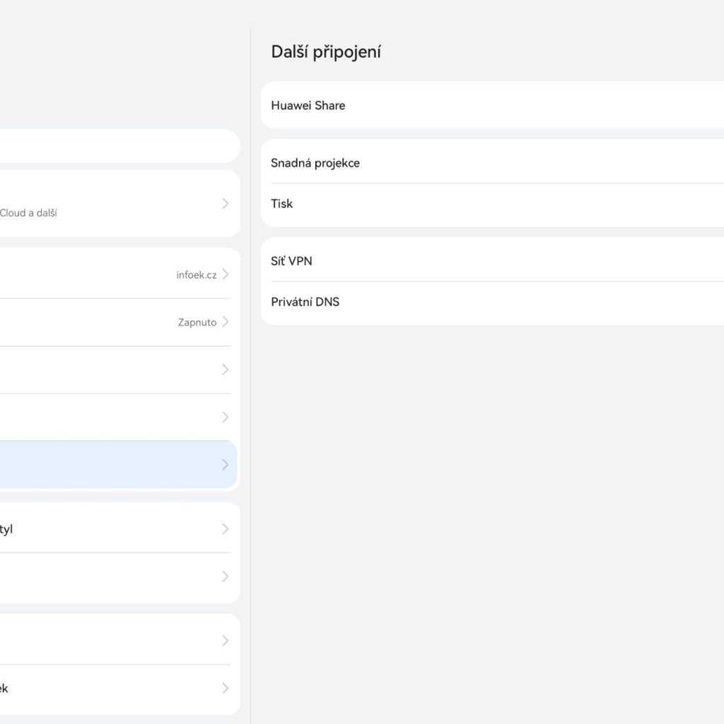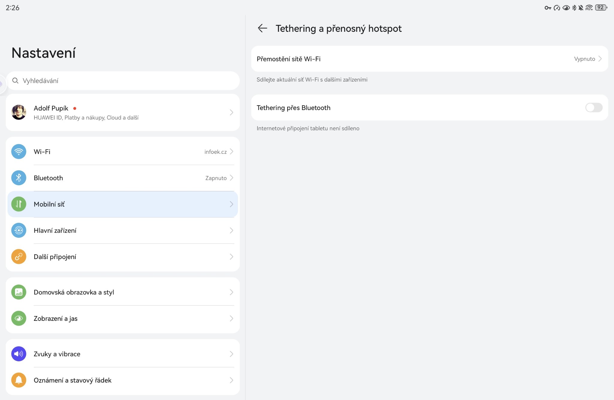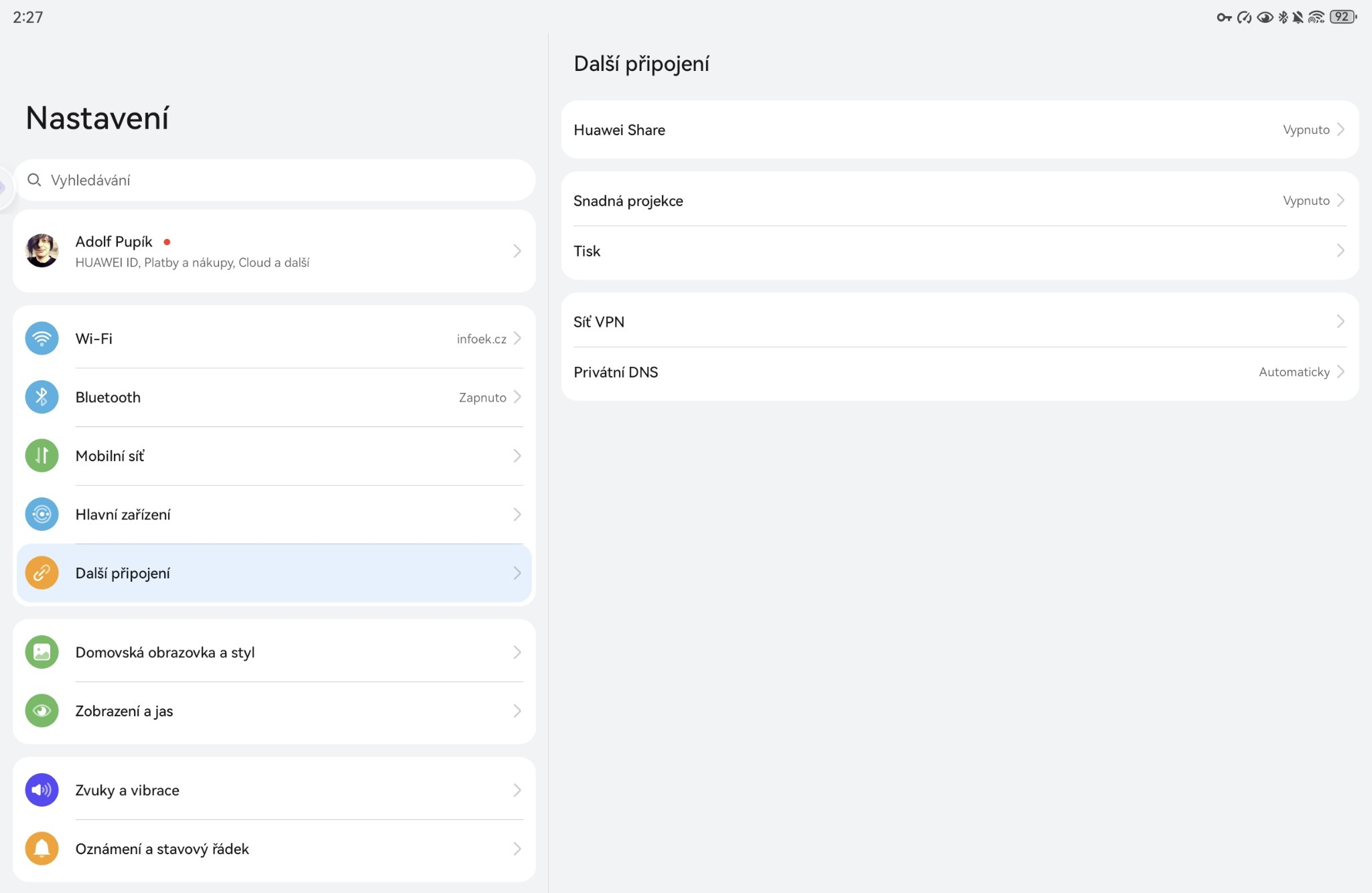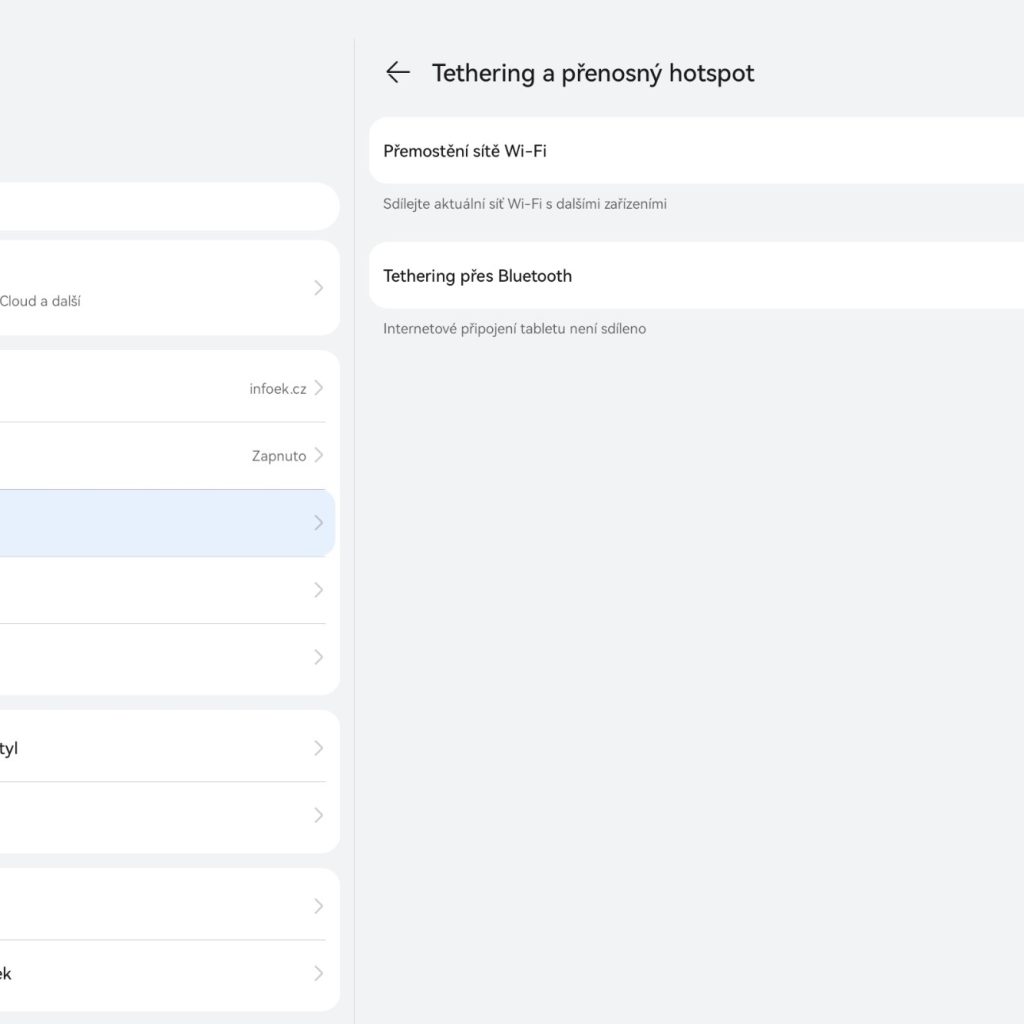 V nabídce tabletu najdete také možnost vytvoření Wi-Fi hotspotu s vlastním názvem a heslem. I když zařízení nemá slot pro nanoSIM kartu, lze přemostit Wi-Fi síť. Tuto funkci občas využívám pro různé experimenty s ADB, bezpečnostními kamerami a podobně. Bez problémů funguje i anonymizace IP adres pomocí VPN, stejně jako bezdrátová projekce obrazu do chytrých televizorů. Máte mobil nebo notebook značky Huawei? Pak můžete využít funkci Huawei Share pro rychlý přenos dat mezi zařízeními nebo třeba pro vyřizování hovorů na MateBooku.