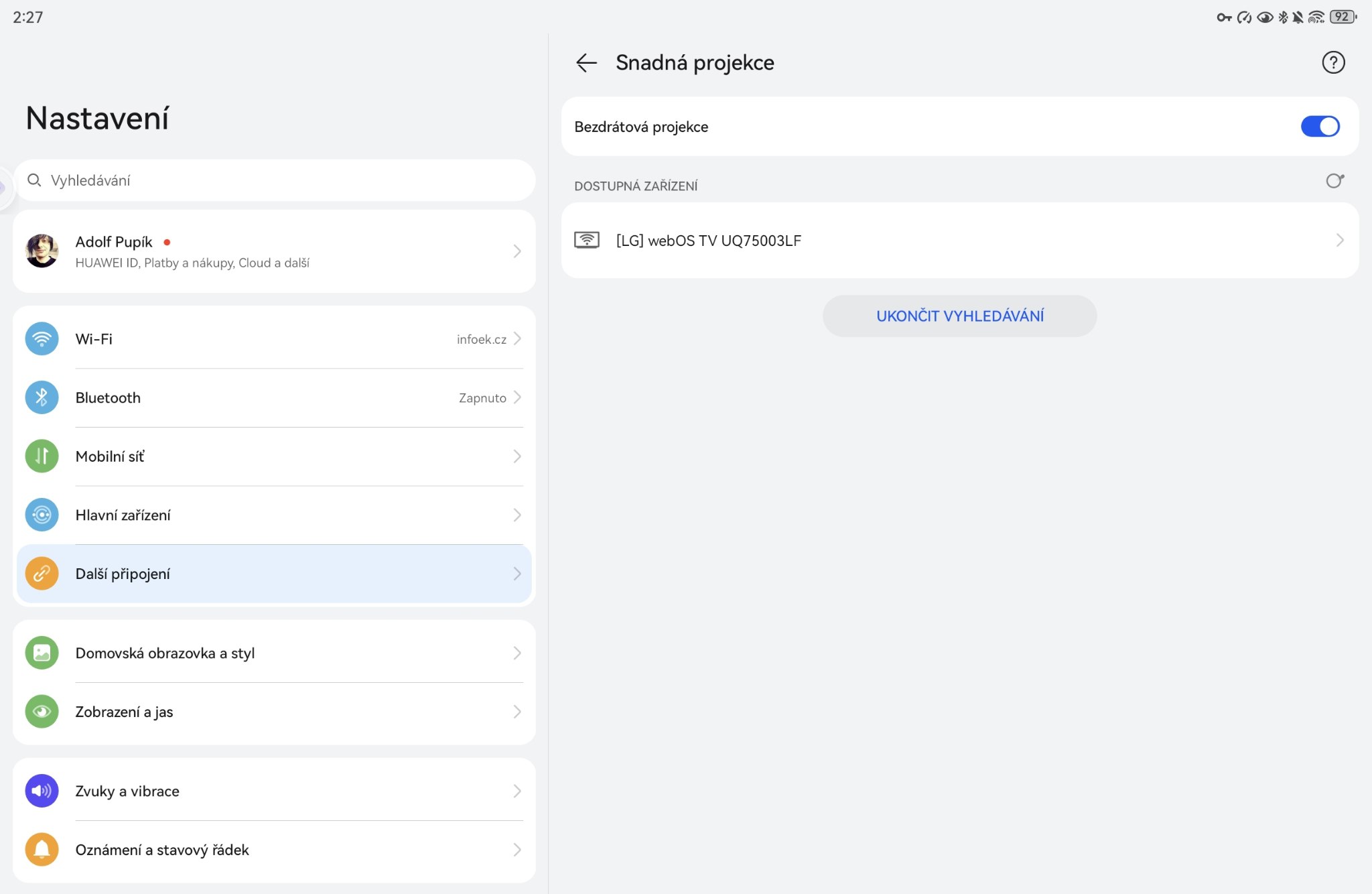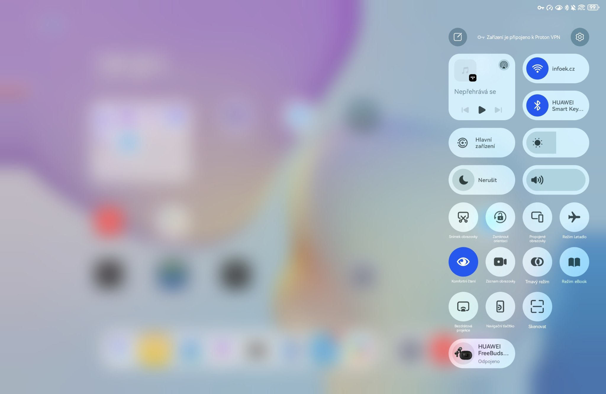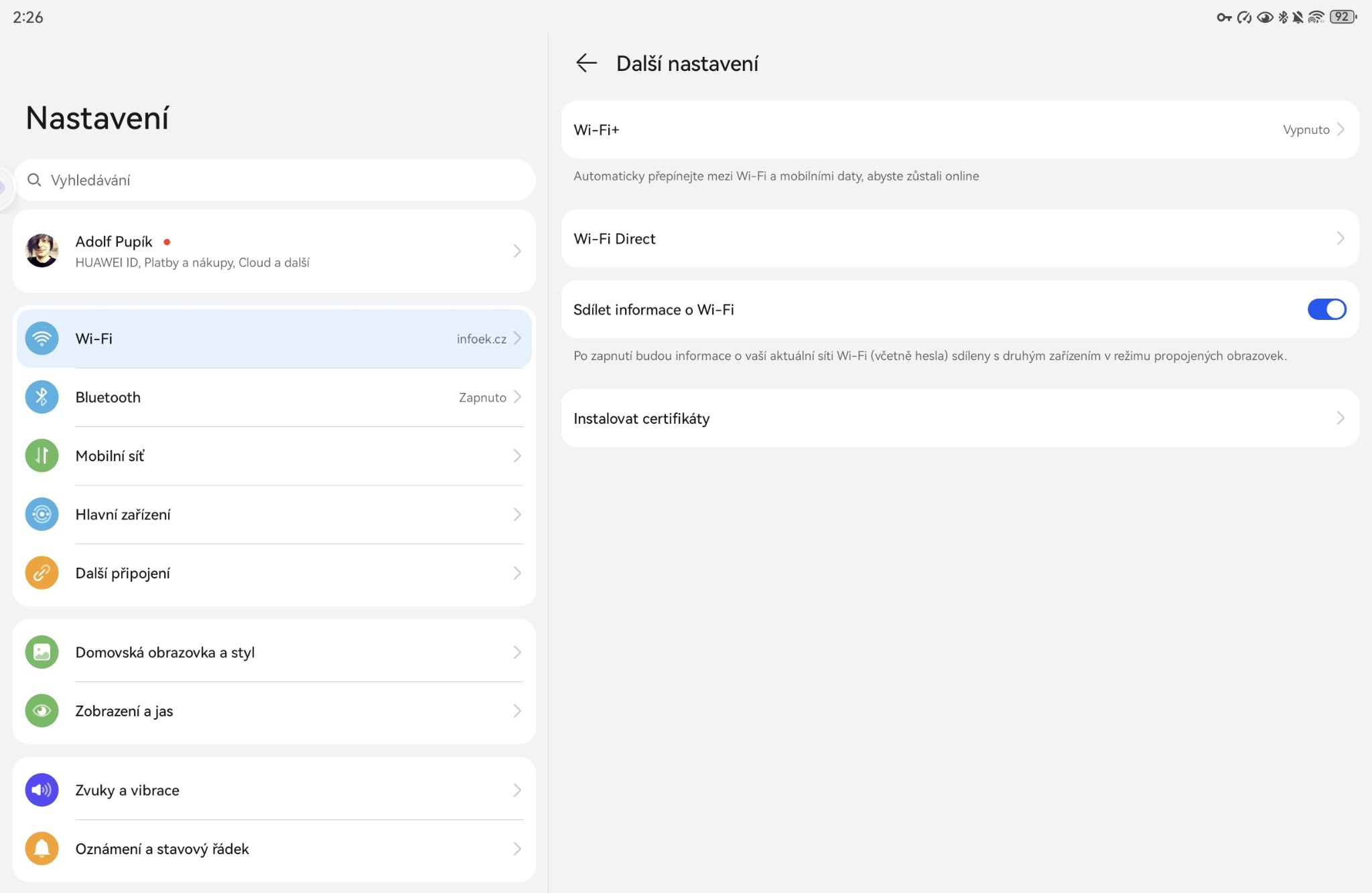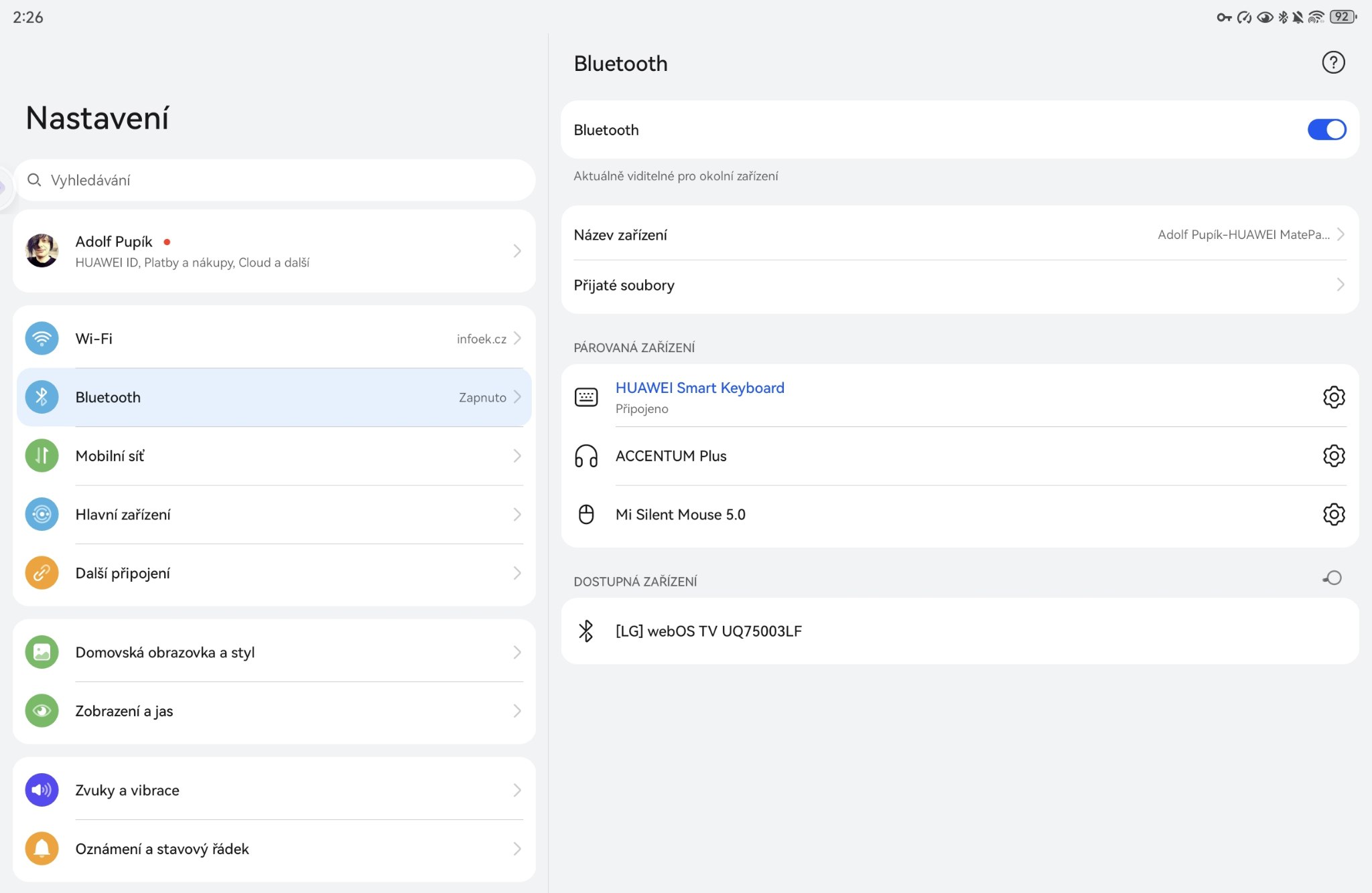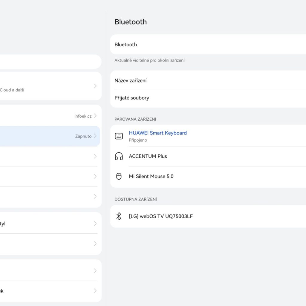 V nabídce tabletu najdete také možnost vytvoření Wi-Fi hotspotu s vlastním názvem a heslem. I když zařízení nemá slot pro nanoSIM kartu, lze přemostit Wi-Fi síť. Tuto funkci občas využívám pro různé experimenty s ADB, bezpečnostními kamerami a podobně. Bez problémů funguje i anonymizace IP adres pomocí VPN, stejně jako bezdrátová projekce obrazu do chytrých televizorů. Máte mobil nebo notebook značky Huawei? Pak můžete využít funkci Huawei Share pro rychlý přenos dat mezi zařízeními nebo třeba pro vyřizování hovorů na MateBooku.