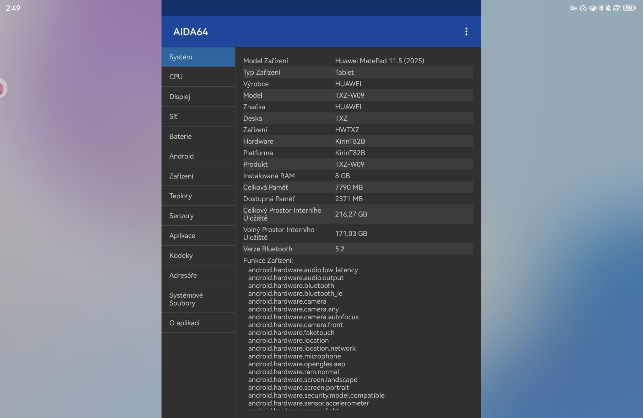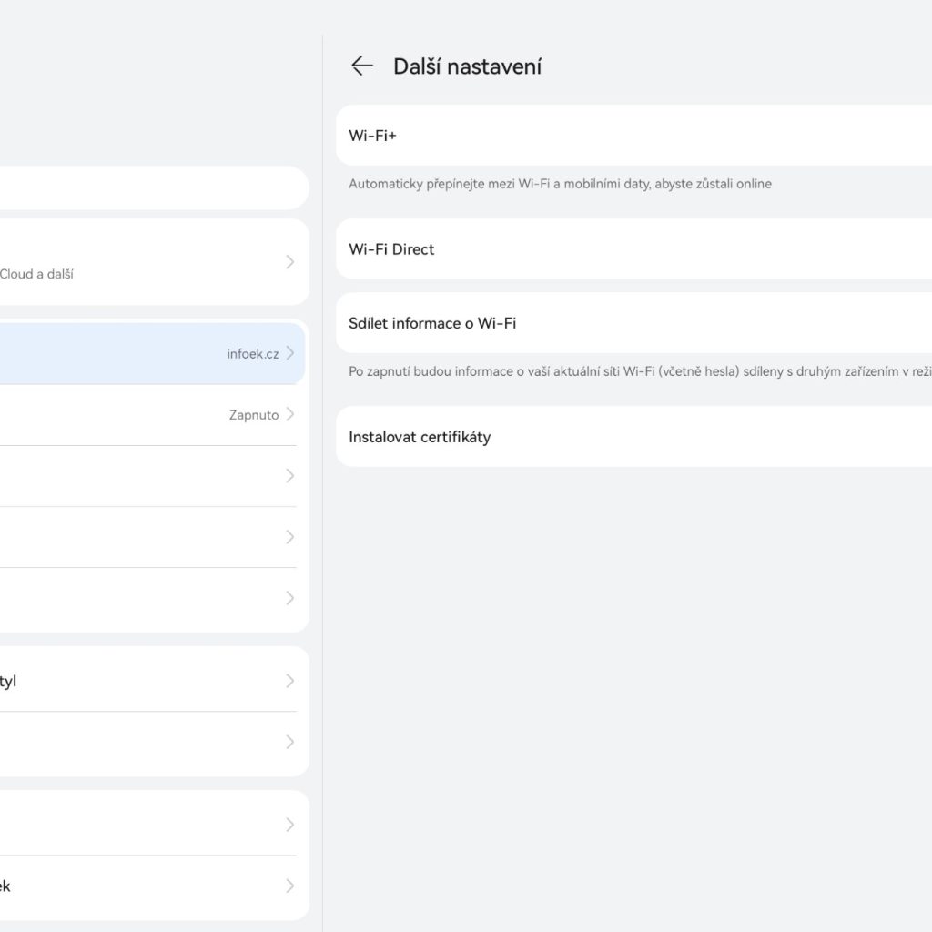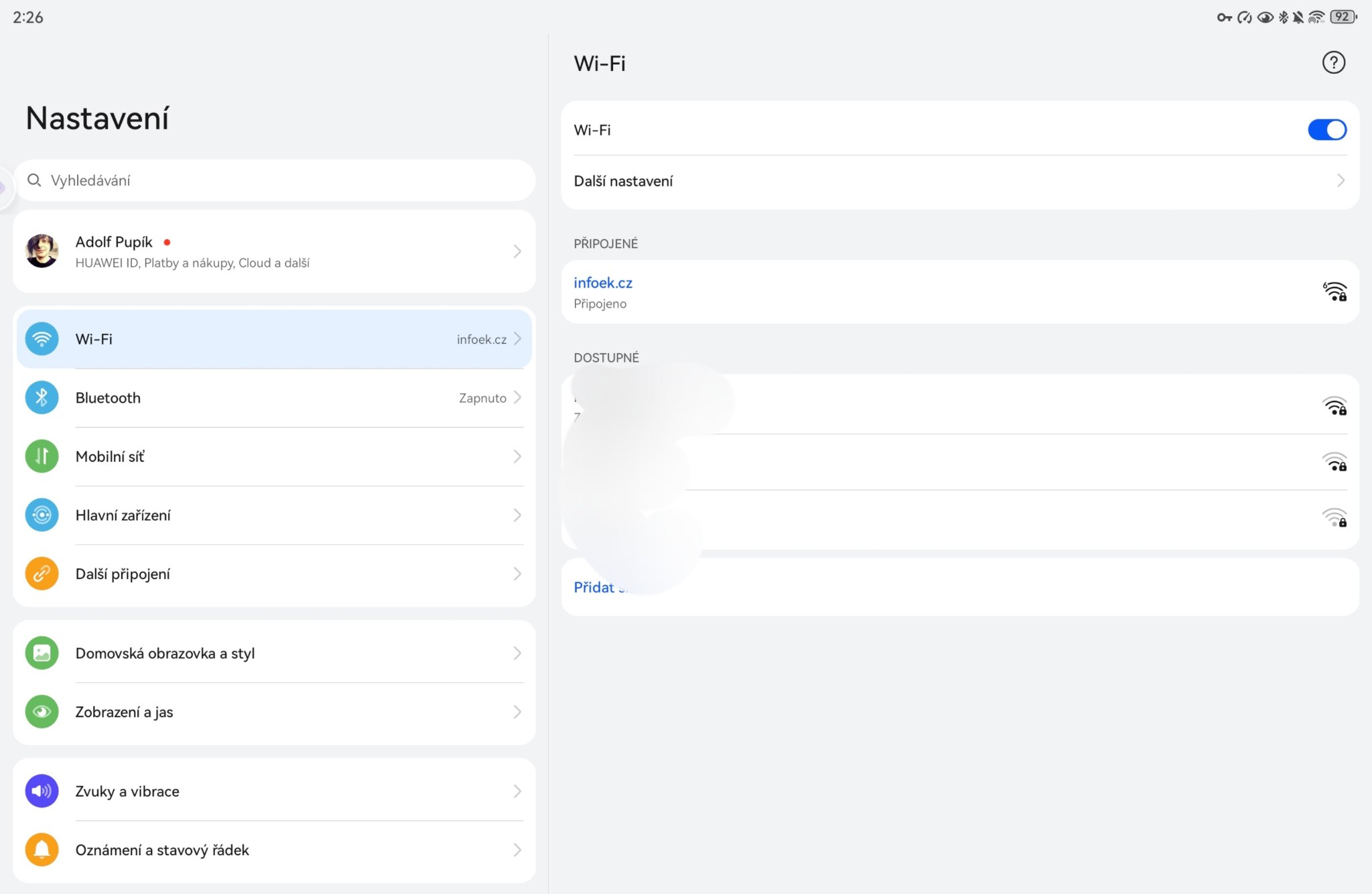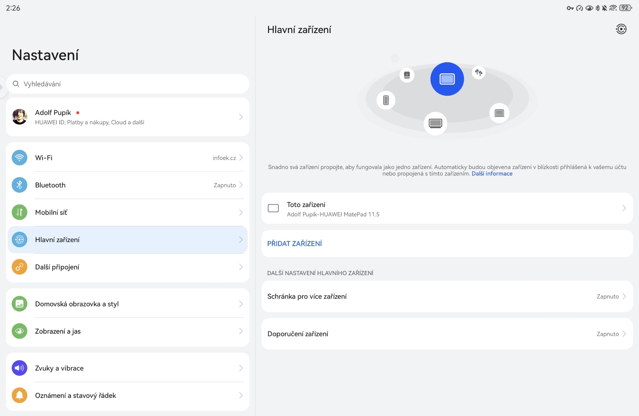 V nabídce tabletu najdete také možnost vytvoření Wi-Fi hotspotu s vlastním názvem a heslem. I když zařízení nemá slot pro nanoSIM kartu, lze přemostit Wi-Fi síť. Tuto funkci občas využívám pro různé experimenty s ADB, bezpečnostními kamerami a podobně. Bez problémů funguje i anonymizace IP adres pomocí VPN, stejně jako bezdrátová projekce obrazu do chytrých televizorů. Máte mobil nebo notebook značky Huawei? Pak můžete využít funkci Huawei Share pro rychlý přenos dat mezi zařízeními nebo třeba pro vyřizování hovorů na MateBooku.