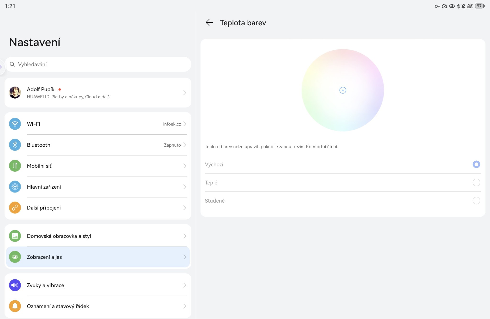 Jak už samotný název tabletu napovídá, nabízí velký 11,5palcový displej. Použit byl IPS panel s rozlišením 2456 × 1600 px a jemností 256 PPI. Obnovovací frekvence může být 90 nebo 120 Hz – panel ji dokáže přizpůsobovat automaticky, ale lze ji i pevně nastavit. Kolem displeje jsou jen velmi tenké rámečky, přesto se tablet dobře drží a pohodlně ovládá. Potěší i zdařilé barevné podání s možností vlastní úpravy. Spokojený jsem byl i s maximálním jasem 600 nitů a automatickou regulací podsvícení.