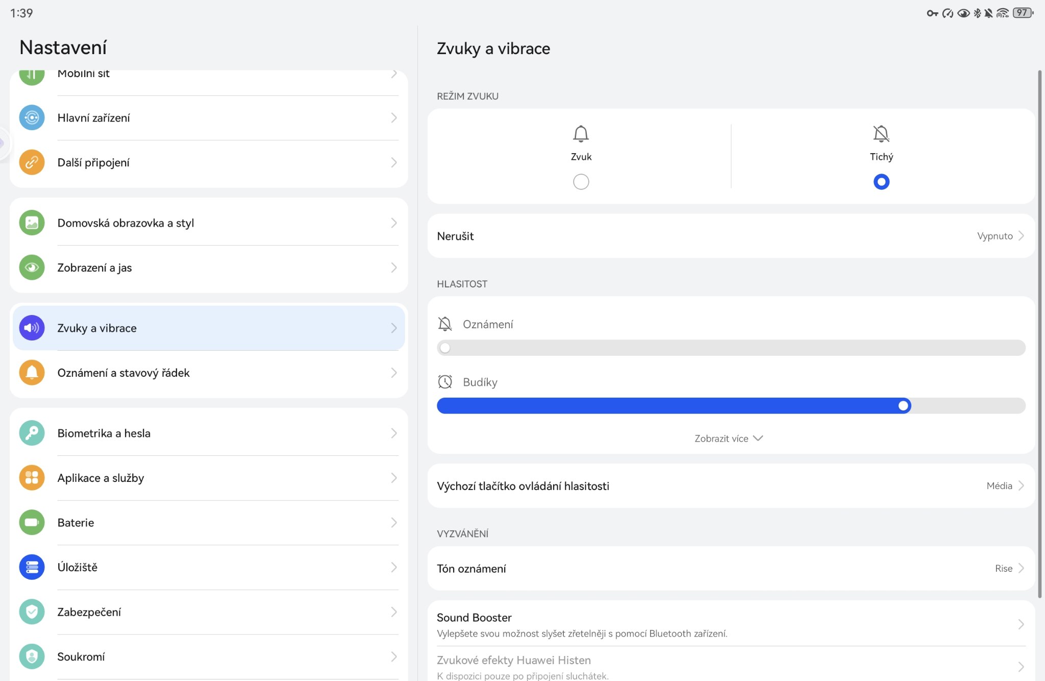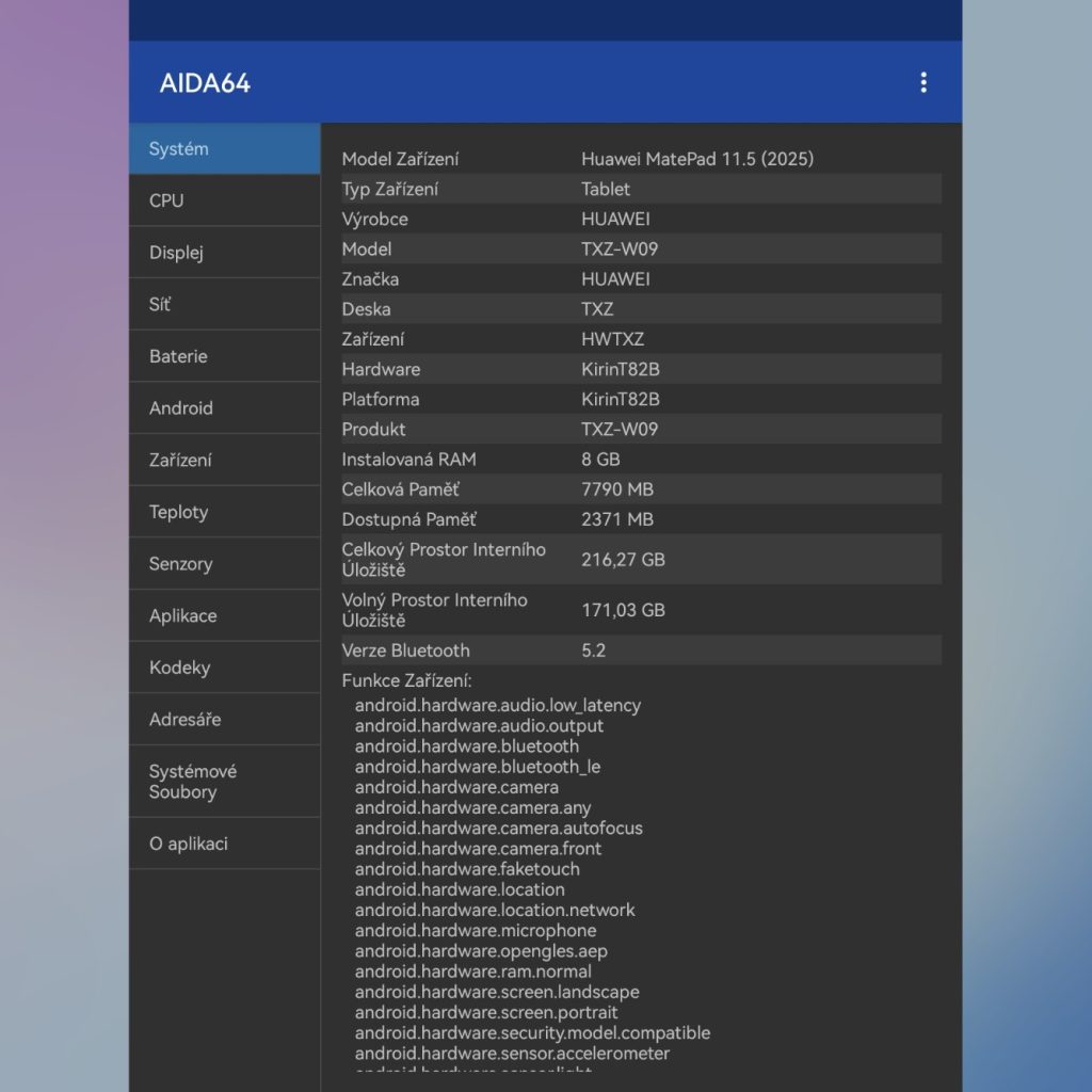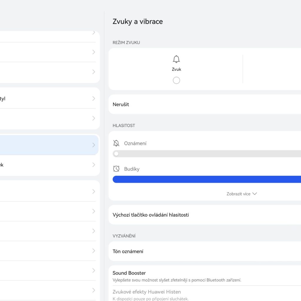Sluchátkový 3,5mm jack už tablet nenabízí, což dnes asi nikoho nepřekvapí. Náročnější posluchači mohou využít externí DAC nebo sluchátkový zesilovač a vychutnat si tak hudbu v maximální kvalitě přes kabelová sluchátka. Samozřejmostí je i možnost připojení bezdrátových sluchátek či reproduktorů díky Bluetooth 5.2. Škoda jen, že Huawei nesáhl po novější verzi 5.4, kterou už část konkurence nabízí. Na druhou stranu připojení bylo vždy stabilní a Huawei optimalizaci dlouhodobě zvládá velmi dobře. Menší nevýhodou je snad jen absence audio kodeků AptX od Qualcommu – k dispozici jsou: LDAC, L2HC, AAC a SBC. Já k tabletu připojil sluchátek více a samozřejmě můžete používat i ty s kodekem AptX. Drtivá většina lidí nepocítí absenci kodeky, audiofil však může chtít víc než vzorkovací frekvenci 44,1 Hz se 16 bity.
