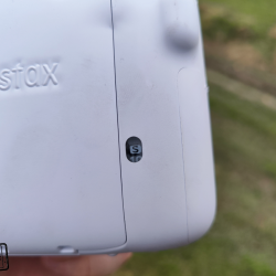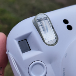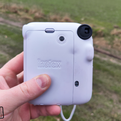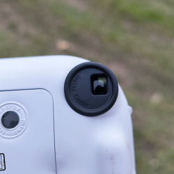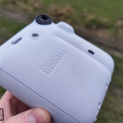 Na zádech fotoaparátu se pak nachází hledáček pro možnost pozorování toho, co zrovna fotíte. Všimnout si můžete i malého náhledu dovnitř fotoaparátu, díky kterému můžete zkontrolovat správné vložení plastové kazety s fotopapíry. Nasazeno bylo i počítadlo zbývajících snímků. Nechybí ani větší dvířka s logem Instaxu, pod kterými se ukrývá prostor pro vložení plastové kazety s fotopapíry.