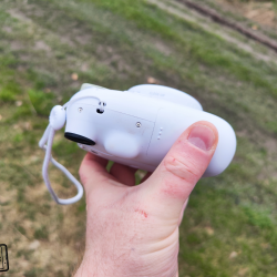 Levý bok je zcela prázdný a v pravém boku se ukrývá prostor pro vložení dvou AA baterií. Zapomenout nesmím ani na části pro provléknutí poutka z prodejního balení. Vlastně je možné poutko uchytit na obou stranách fotoaparátu a je jen na vás, na jaké straně vám bude vyhovovat více. Pokud si seženete druhé, můžete mít na fotoaparátu poutka klidně dvě. 😀 Všude po stranách se nachází také malé skutečné šroubky, které mohou posloužit v případě potřeby pro odborný servis. Horní část fotoaparátu logicky nabízí už jen výřez pro pořízené snímky. Vespod fotoaparátu pak jsou nožičky pro případné postavení třeba na stole a opět jsou přítomny i šroubky.