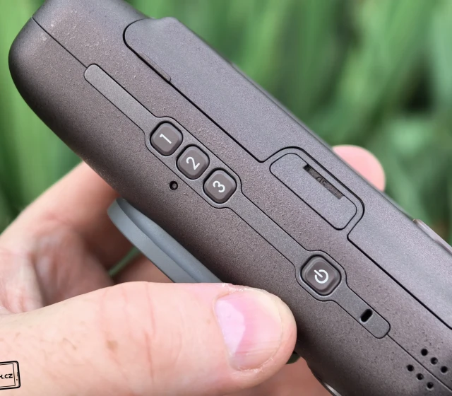 Fotoaparát má hezky oblé strany, aby skvěle padl do rukou. Všechny důležité prvky jsou také ideálně umístěny a snadno třeba dosáhnete na spoušť. Najdete ji v horním tlačítku na čelní části fotoaparátu. Nachází se tam také modul s LED bleskem, optikou a zrcátkem pro možnost fotit selfie. Dole je pak tlačítko pro nahrání zvuku, ale k tomu se dostanu ještě později. Ve videu níže můžete vidět, že jsem to zvládl jednou rukou. 😉