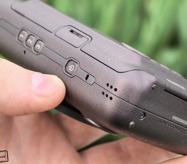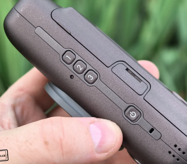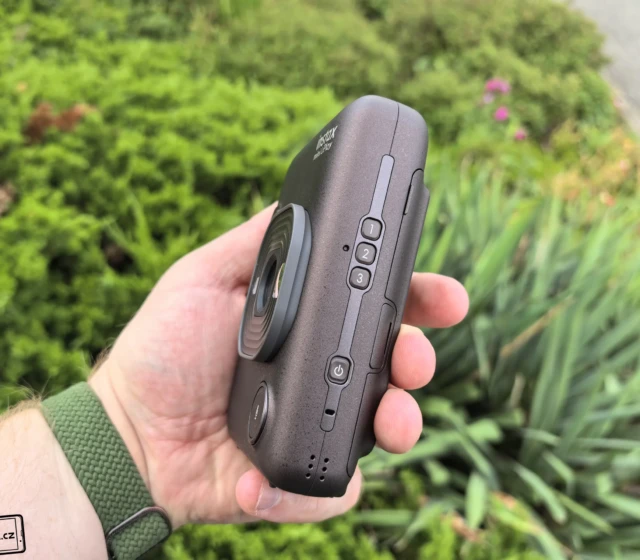 Fotoaparát má hezky oblé strany, aby skvěle padl do rukou. Všechny důležité prvky jsou také ideálně umístěny a snadno třeba dosáhnete na spoušť. Najdete ji v horním tlačítku na čelní části fotoaparátu. Nachází se tam také modul s LED bleskem, optikou a zrcátkem pro možnost fotit selfie. Dole je pak tlačítko pro nahrání zvuku, ale k tomu se dostanu ještě později. Ve videu níže můžete vidět, že jsem to zvládl jednou rukou. 😉