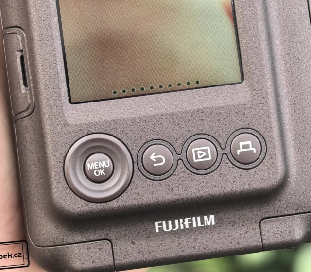 Podívat se musíme samozřejmě také na zadní část, protože tu během focení uvidíte nejčastěji. Nachází se zde dvířka pro vložení kazety s filmy a dokonce 2,7palcový IPS displej. To není ve světě instantních fotoaparátů obvyklé a výrobce za displej musím moc pochválit. Svými barvami v porovnání s mobilem neuchvátí, ale pro všechny funkce fotoaparátu postačí. Pod displejem jsou pak potřebná tlačítka pro ovládání prostředí systému ve fotoaparátu.