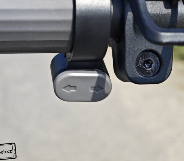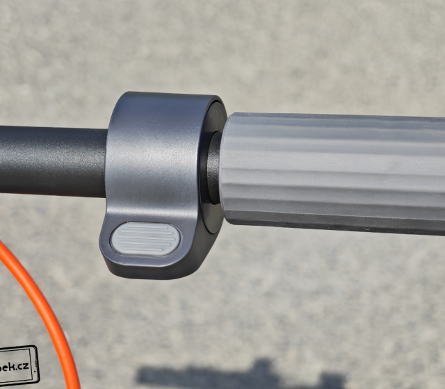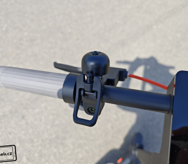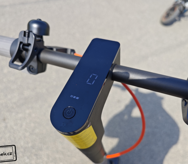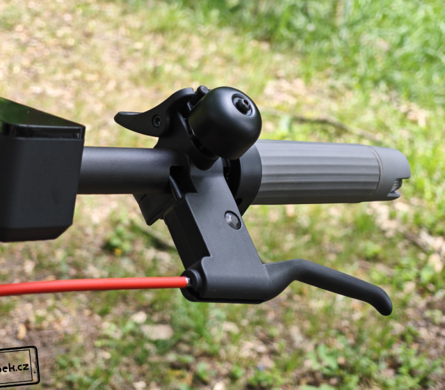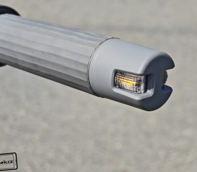 Řídítka na první pohled ničím nevyčnívají, ale na stranách mají zabudované blinkry. Jejich šířka je dostatečná i pro většího muže a vše je hned po ruce. Uprostřed najdeme panel s tlačítkem pro zapnutí a vypnutí koloběžky, přepínání jízdních režimů, zapnutí světel nebo zvýšení jasu displeje. Displej vlastně musím výrobci moc pochválit, protože je čitelný i na slunci, což často nemají ani koloběžky v ceně 25 tisíc Kč. Dále nechybí samozřejmě běžný akcelerátor rychlosti, zvonek a očko pro zachycení při složení řídítek. Díky tomu se koloběžka snadno přenáší v jedné ruce. Výrobci chválím nejen za příjemné a kvalitní gumové protiskluzové rukojeti, ale světlo blinkrů je skutečně vidět i z dálky. Hned po ruce jsou i tlačítka pro ovládání blinkrů a na jejich zapnutí budete upozorněni zvukem. Vypnete je dalším stisknutím stejného tlačítka. Z čelní strany řídítek je zabudované bílé LED světlo, které je také dostatečně silné a v noci uvidíte nejen vy, ale vidět vás budou i ostatní. K dispozici je samozřejmě i páčka pro ovládání brzdy.