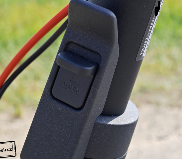 Slabinou velkého množství koloběžek je část „zlomu“ s kloubem. Toho si je výrobce vědom a zpracování nejen kloubu, ale i pojistky chválím. Stačí ji odemknout snadným systémem označeným šipkou s popiskem „Open“. Koloběžku poté můžete snadno složit. Během testování jsem koloběžku trápil nejen na rovné silnici, ale i na lesních nerovných cestách. Kloub držel jak přibitý a neslyšel jsem ani žádné nepříjemné „cvakání“, které slyším často u některých koloběžek.