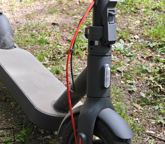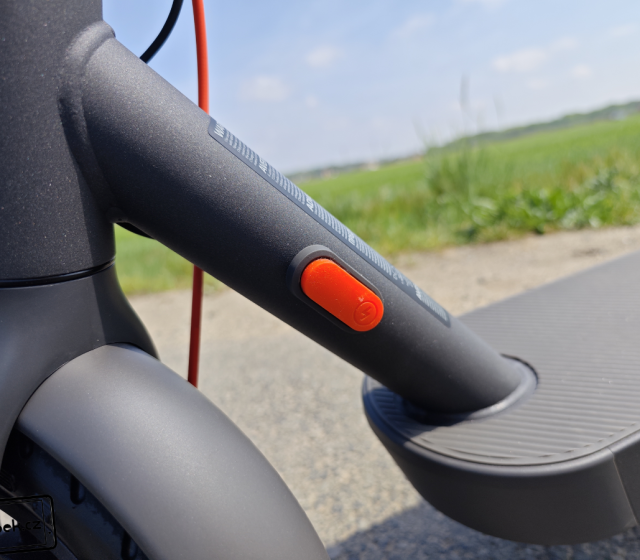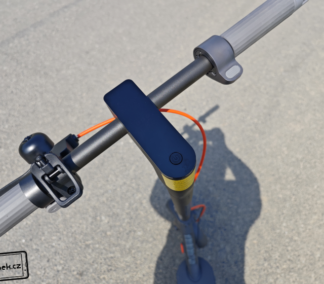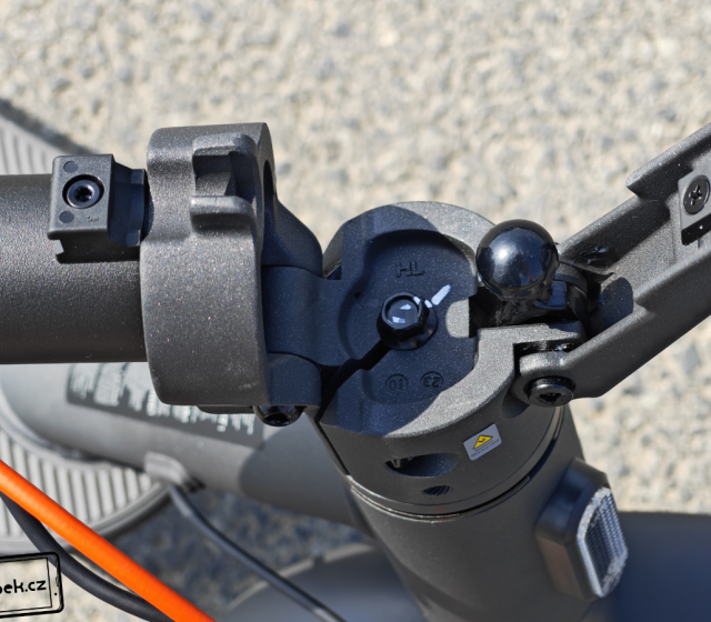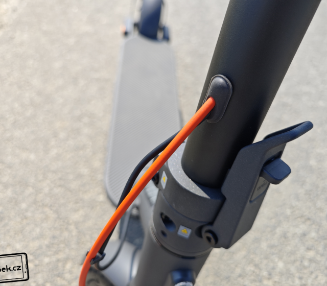 Dle mého názoru výrobce nad celou konstrukcí a designem opravdu přemýšlel. Již od řídítek si totiž můžeme všimnout oranžové úpravy lanovodu, prvků u kol a záslepky nabíjecího konektoru. Oranžová je totiž barva výrobce najdeme ji přímo v jeho logu. Líbí se mi, že to výrobce s oranžovou nijak nepřehnal a jedná se jen o decentní prvky, které design koloběžky umí oživit. Vlastně kombinace tmavé matné barvy společně s oranžovými prvky se mi líbí.