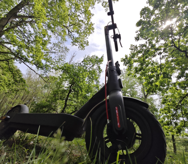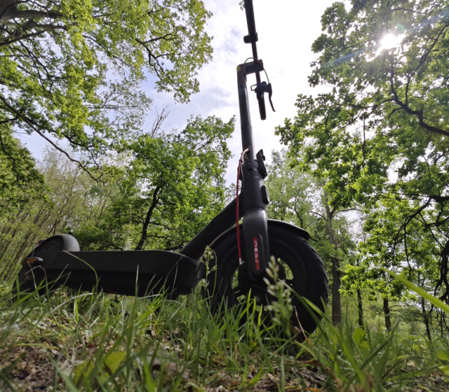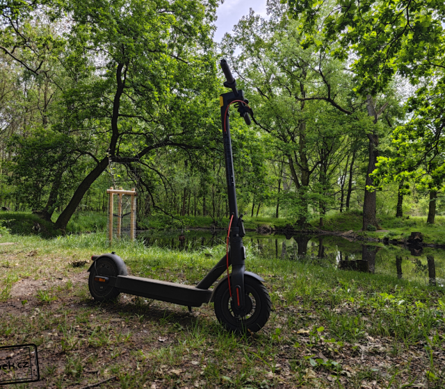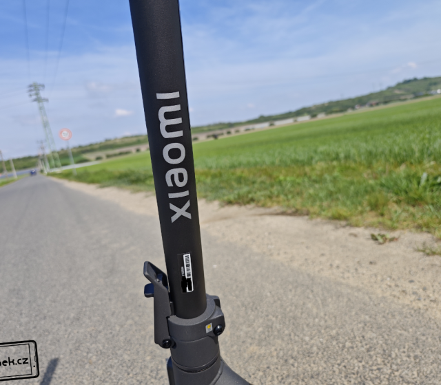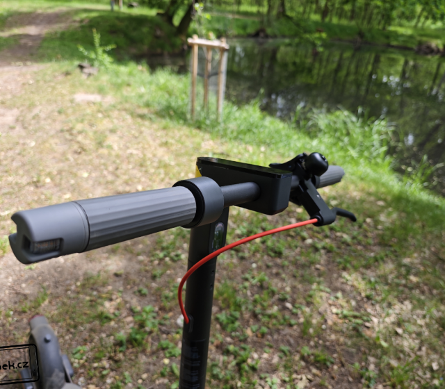 Nejedná se o žádnou velkou elektrickou koloběžku, což vlastně vítám. Díky skladnosti ji můžete převážet, ale takové koloběžky jsou často stavěny jen na silniční povrch. Na silnici se jezdí samozřejmě nejlépe, ale díky širším pneumatikám plněným vzduchem a kvalitním řídítkům se můžete vydat i na nějaký ten štěrk a rád jsem jezdil i na nerovných lesních cestách. Na těch se jezdilo také dost dobře a byla to zábava. Řídítka držela prvně v rukou a ani jednou jsem při svém závodění neupadl. 😀 Skvěle si koloběžka poradila i s větším kopcem a výrobce uvádí úhel stoupání 20%.