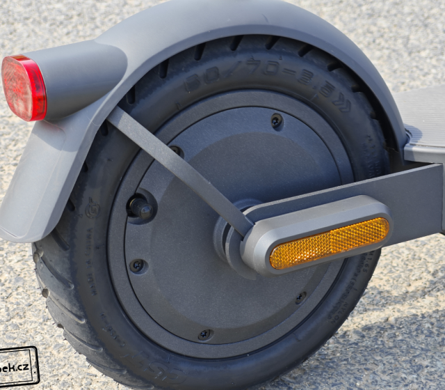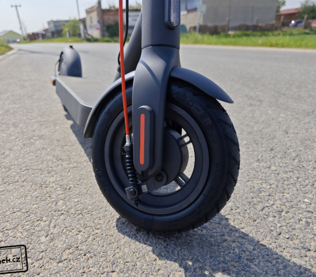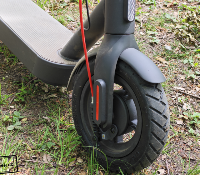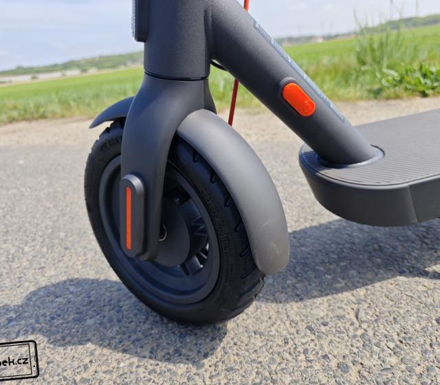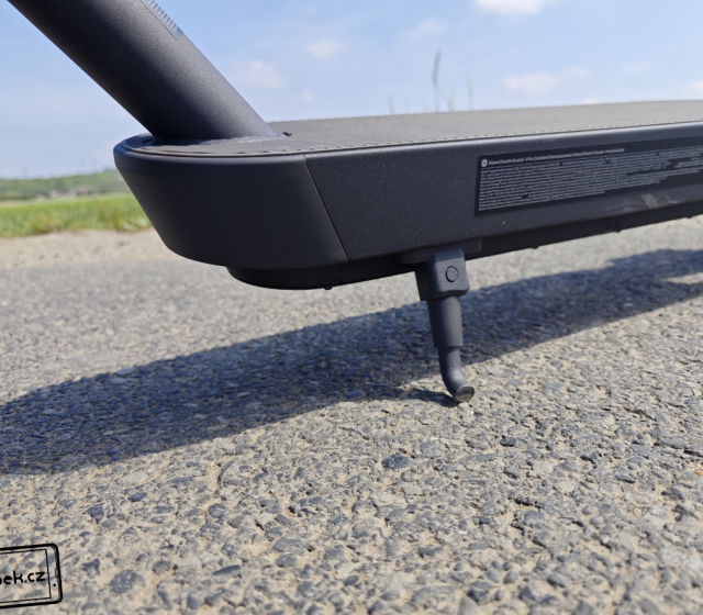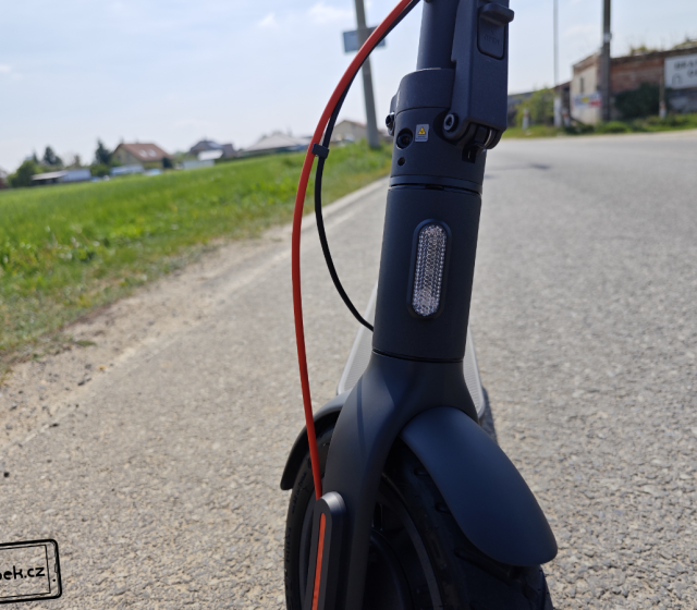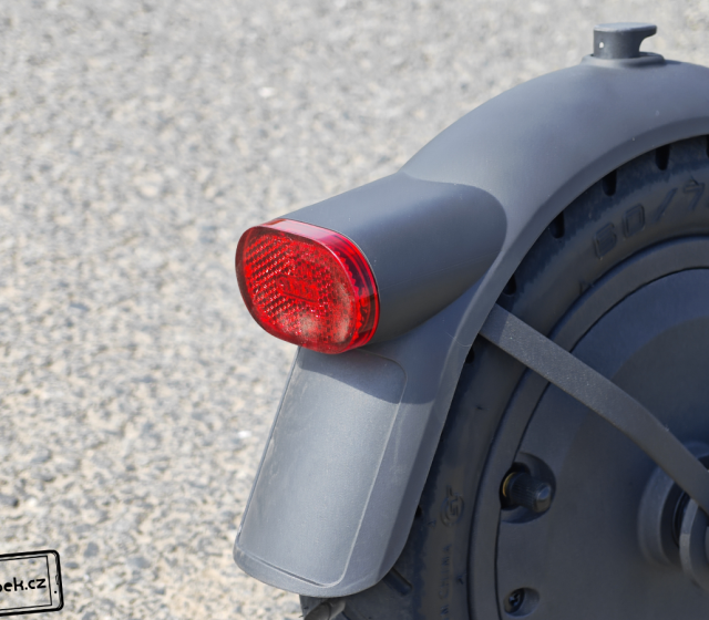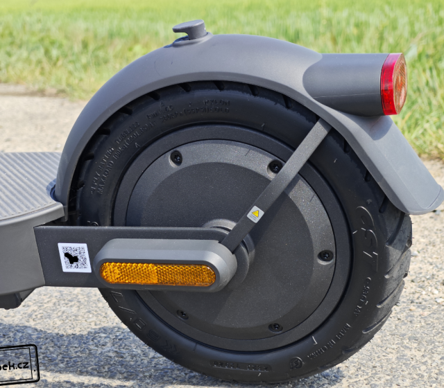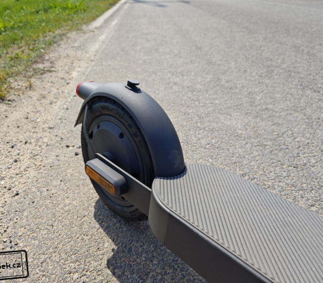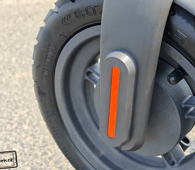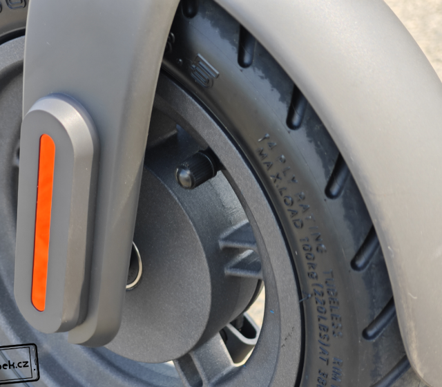 Výrobce nasadil také kvalitní 10palcová kola. Použité pneumatiky působí kvalitním dojmem a líbí se mi jejich šířka. Jsou plněná vzduchem a kdykoliv si je můžete dofouknout kompresorem. Vpředu najdeme také kotoučovou brzdu a pevný blatník. Na zadní části je další kvalitní blatník s červeným a dostatečně silným světlem. Nechybí ani oranžové odrazky po stranách a QR kód pro spárování s mobilní aplikací. Část pro stání je dostatečně široká (165 mm), líbí se mi její design a díky pogumování nebudete z koloběžky klouzat. Nesmí chybět ani kvalitní stojánek, který je sice nezvykle krátký, ale je naprosto dostatečný a neměl jsem se stáním koloběžky problém.