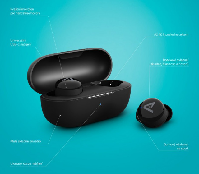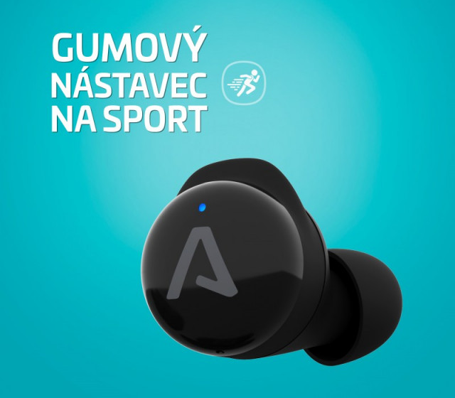 Uvnitř krabičky najdeme dvojici bezdrátových sluchátek. Ta na sobě mají dotykovou plochu s logem výrobce a někteří jistě ocení i gumový nástavec, díky kterému sluchátka výborně drží v uších, a to i při běhu. Pokud by vám nástavec vadil, můžete ho ze sluchátej sundat. Ergonomie sluchátek je výborná a alespoň v mém případě se sluchátka nosila pohodlně. Aby správně seděla v uších, je dobré si vybrat i pro vaše uši ideální gumový špunt. Více velikostí špuntů najdete v prodejním balení. Každé sluchátko pak váží pouze 5 gramů a dle výrobce vydrží vystavení potu a vlhka.