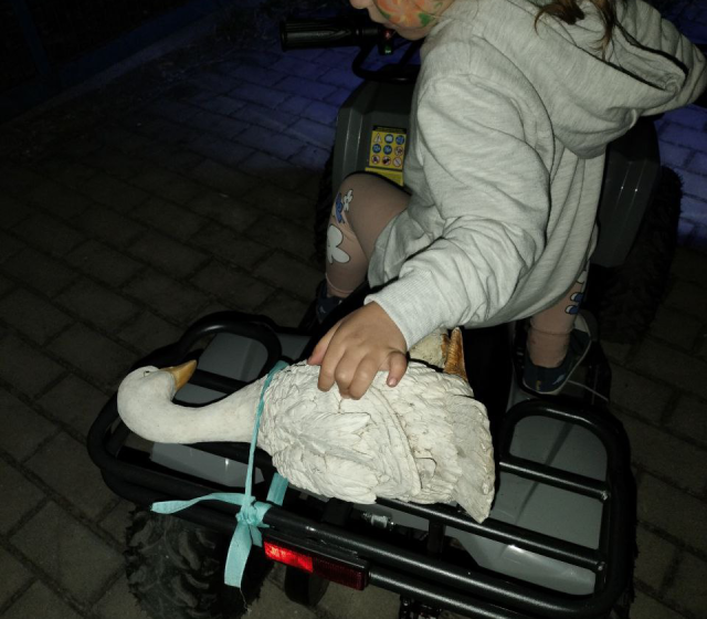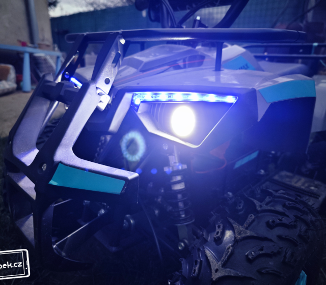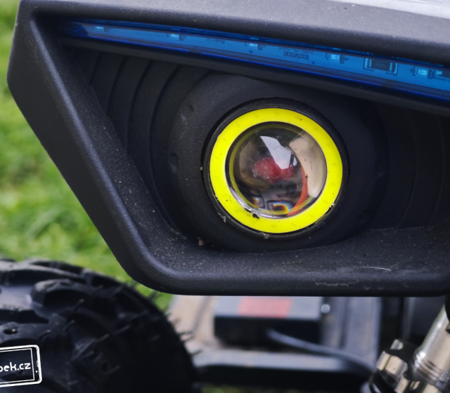 Nesmí ani chybět LED světla vpředu. Jejich svit je opravdu silný, takže dítko při večerních projížďkách uvidíte nejen vy, ale i případný řidič vozidla poblíž. Malý závodník na čtyřkolce si také díky silným světlům všimne každé nerovnosti a na zadní část čtyřkolky si klidně může naložit nějaký náklad. V našem případě to byla kachna viz fotky v galérii níže… 😀 Je jen škoda, že vzadu není třeba nějaké malé červené světlo. Je tam však naštěstí červená odrazka. Kdyby někdo chtěl přeci jen světlo, jistě do 100 Kč v obchodech nějaké najde.