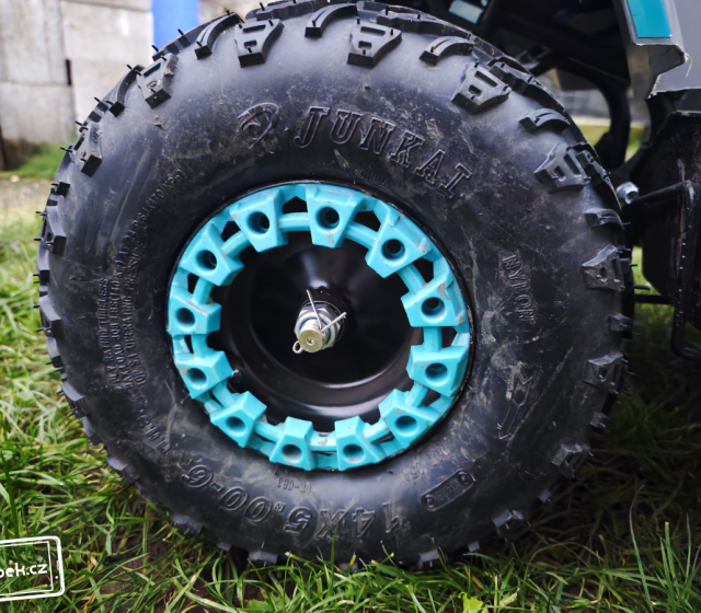 Čtyřkolka poskytuje 14palcová kola nafouklá vzduchem (6palcové ráfky) a výrobce uvádí, že jejich pláště jsou vyztužené, aby se zabránilo defektům. Chválím za vzorek na gumách, díky kterému kola neprokluzují ani za horšího počasí. To je totiž častý problém jiných elektrických vozítek pro děti. Vpředu se nachází dva a vzadu jeden tlumič, aby byla jízda v terénu pohodlná. Jejich sílu si můžete seřídit sami dle svých potřeb. Sedlo je možné také vyjmout, aby byl přístup k seřízení zadního tlumiče snadnější. Vpředu i vzadu se nachází kotoučové brzdy, a ty si imbusovým klíčem můžete seřídit také.
