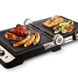 Konstrukční zpracování grilu je výborné a výrobce sáhl především po nerezové oceli. Moc pěkné je designové madlo a gril můžete používat v rozloženém, ale i zavřeném stavu. Maso tedy bude opečeno z obou stran a během testování nebyl problém ani s přípravou tortil. V zavřeném stavu vpravo se nachází i zámek, aby se gril neotevíral a maso bylo pěkně propečené z obou stran. V otevřeném stavu máte k dispozici hezky velké plotýnky, které mají nepřilnavý povrch a jsou vyjímatelné. Snadno je můžete po grilování vyjmout a ručně či v myčce umýt. I mytí v ruce je snadné, což já osobně vidím moc rád.