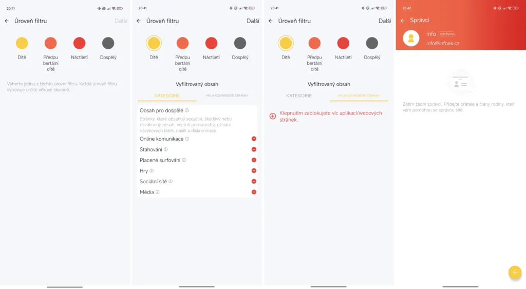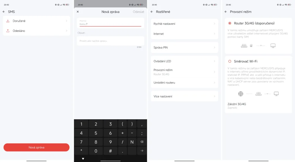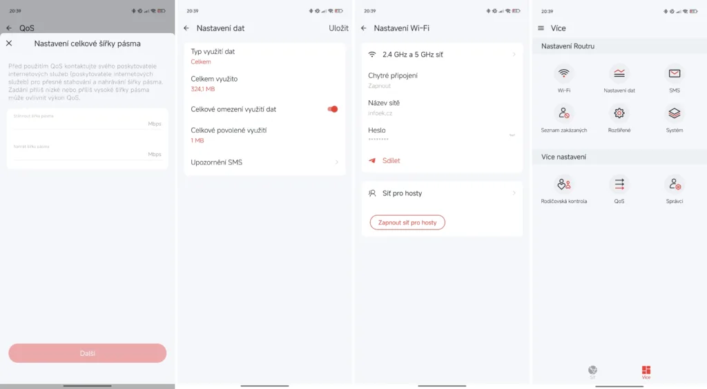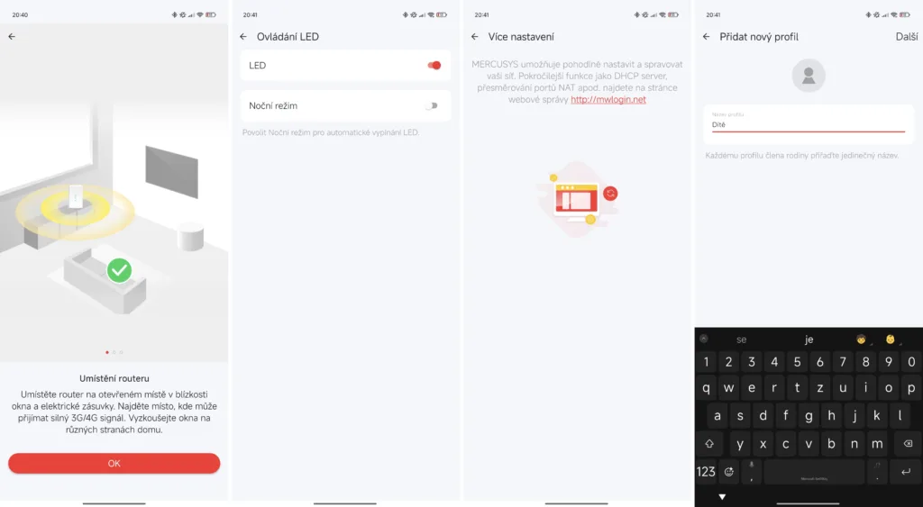 Výrobce ke svým řešením nabízí mobilní aplikaci MERCUSYS pro mobily s Androidem a iOS. Její prostředí je celé přeloženo do češtiny a prvotní nastavení routeru je extrémně jednoduché. Provede vás jednoduchými kroky a zapotřebí bude se jen zaregistrovat. V dalších krocích jen vyberete typ vašeho připojení, název sítě Wi-Fi 5 (5 GHz) a Wi-Fi 4 (2,4 GHz) a případně jejich zabezpečení WPA3/WPA2/WPA. Nastavit můžete i síť vyhrazenou pro hosty, datové limity, určit více správců pro správu routeru, sledovat připojená zařízení a nastavit k nim priority, prohlížet spotřebu dat, nastavit blokování v rodičovském zámku a ze SIM v routeru přijímat nebo posílat SMS zprávy.