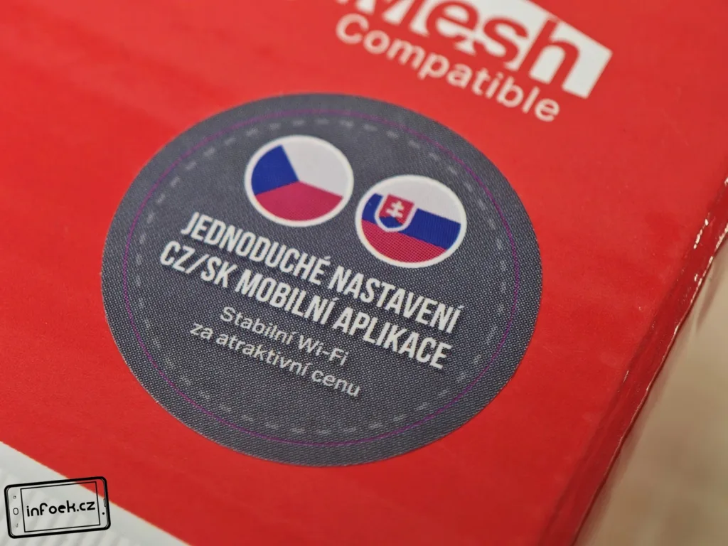 V červené krabičce k Wi-Fi routeru dostanete potřebný základ. K dispozici je adaptér do zásuvky s integrovaným napájecím kabelem, žlutý ethernetový kabel a různé návody. Nic víc ani potřebovat nebudete.