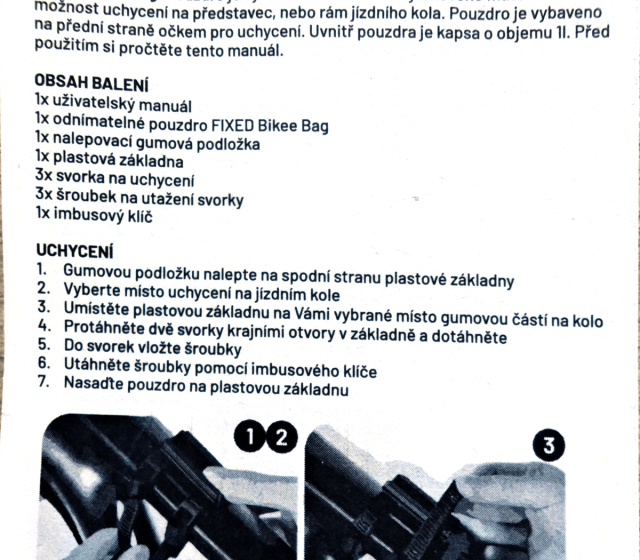 Poutka a šroubky najdete po vybalení v malém sáčku, který se nachází přímo v pouzdře. Poutka plastovou základnou stačí provléknout, přichytit na kolo nebo koloběžku a pomocí přiložených šroubků dotáhnout. Dle mého názoru se jedná o ideální řešení a zvládne to naprosto každý. Nechybí dobře znázorněný návod v češtině a imbusový klíč.