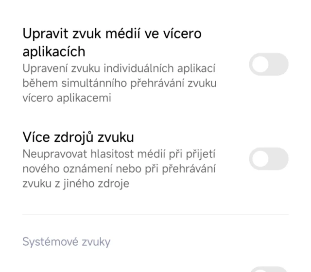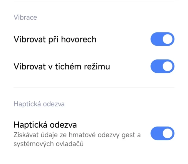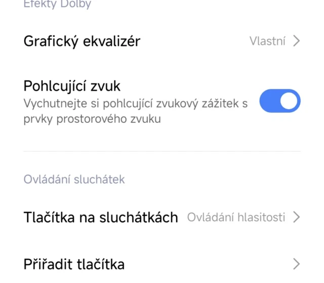 V nastavení telefonu si můžete nastavit rozdělené ovládání hlasitosti do různých aplikací a zapnout lze i haptickou odezvu. Sílu haptiky si můžete manuálně poupravit a vlastně nefunguje špatně. V nastavení je k dispozici také funkce Dolby Atmos a ekvalizér.