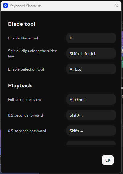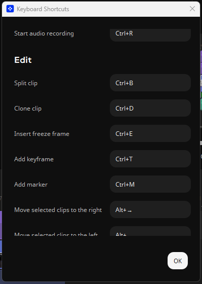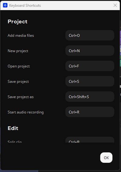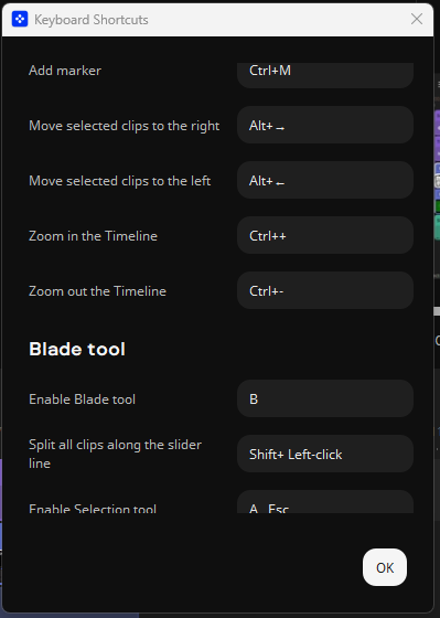 Prostředí aplikace můžete ovládat především myší, různé prvky přesouvat dle svých potřeb. Přesunout kurzorem myši můžete fotky či video rovnou do aplikace z libovolné složky počítače. Chválím, že podporovány jsou některé klávesové zkratky. Klávesou „Delete“ můžete rychle odstranit označenou část videa či hudby. Fungují i některé klávesové zkratky např. pro zkopírování a vkládání videa či skladby. Klávesové zkratky si i můžeze nastavit podle sebe v: Export, Keyboard Shortcuts.