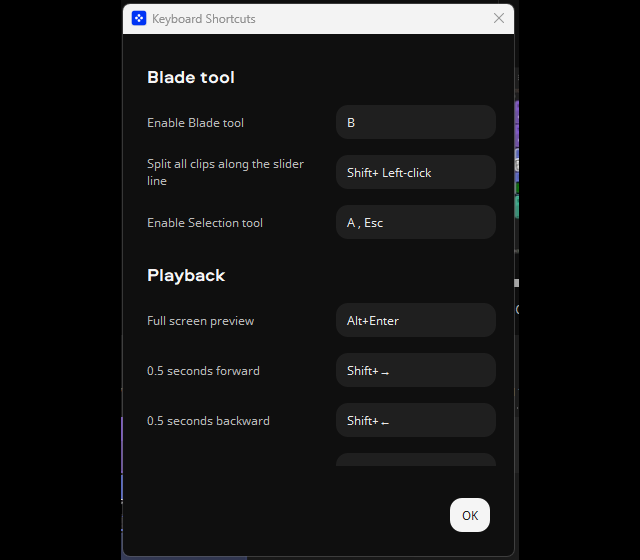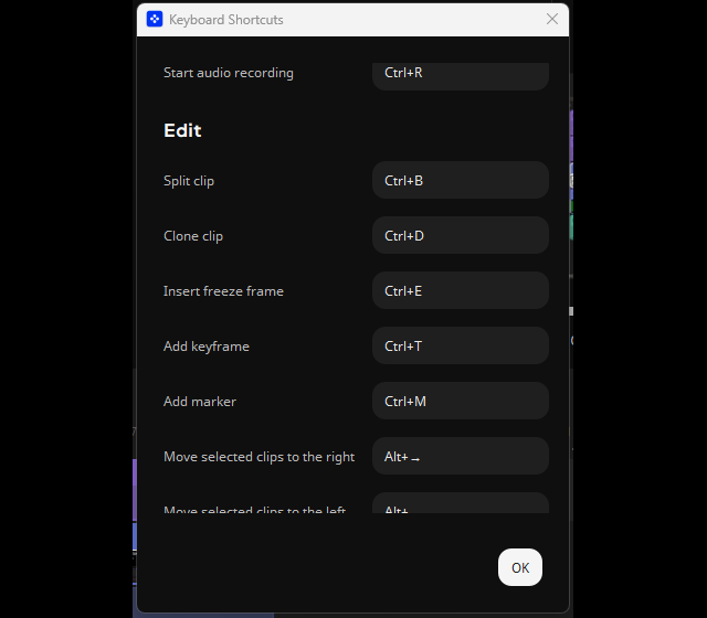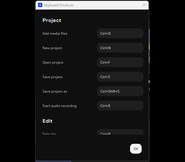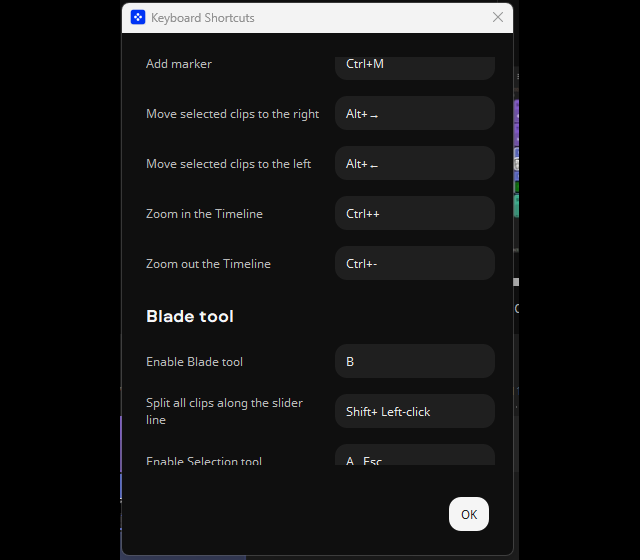 Prostředí aplikace můžete ovládat především myší, různé prvky přesouvat dle svých potřeb. Přesunout kurzorem myši můžete fotky či video rovnou do aplikace z libovolné složky počítače. Chválím, že podporovány jsou některé klávesové zkratky. Klávesou „Delete“ můžete rychle odstranit označenou část videa či hudby. Fungují i některé klávesové zkratky např. pro zkopírování a vkládání videa či skladby. Klávesové zkratky si i můžeze nastavit podle sebe v: Export, Keyboard Shortcuts.
