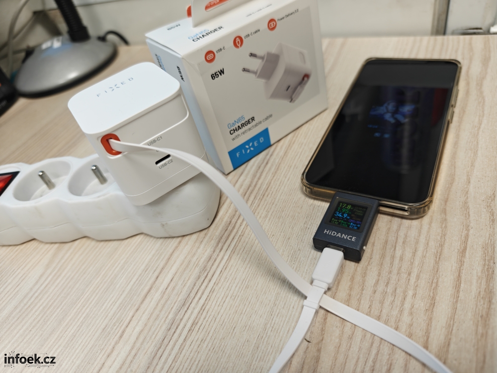 Během testů jsem naměřil výkon 62–63,2 W při nabíjení mobilů Xiaomi 15, Nothing Phone (3) a powerbanky FIXED Zem 20 Pro. Při nabíjení dochází k drobným ztrátám, což je běžné u jakéhokoliv adaptéru. Udávaný výkon 65 W je tedy realitou a výrobce nelže. K přehřívání adaptéru ani nabíjených zařízení nedocházelo.