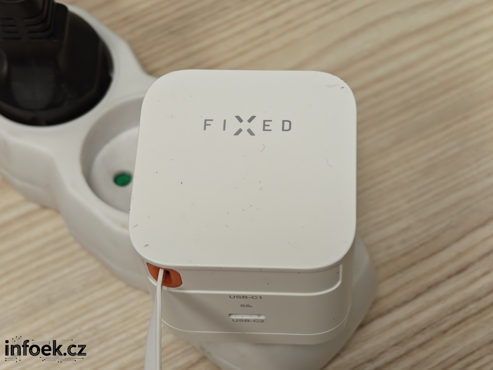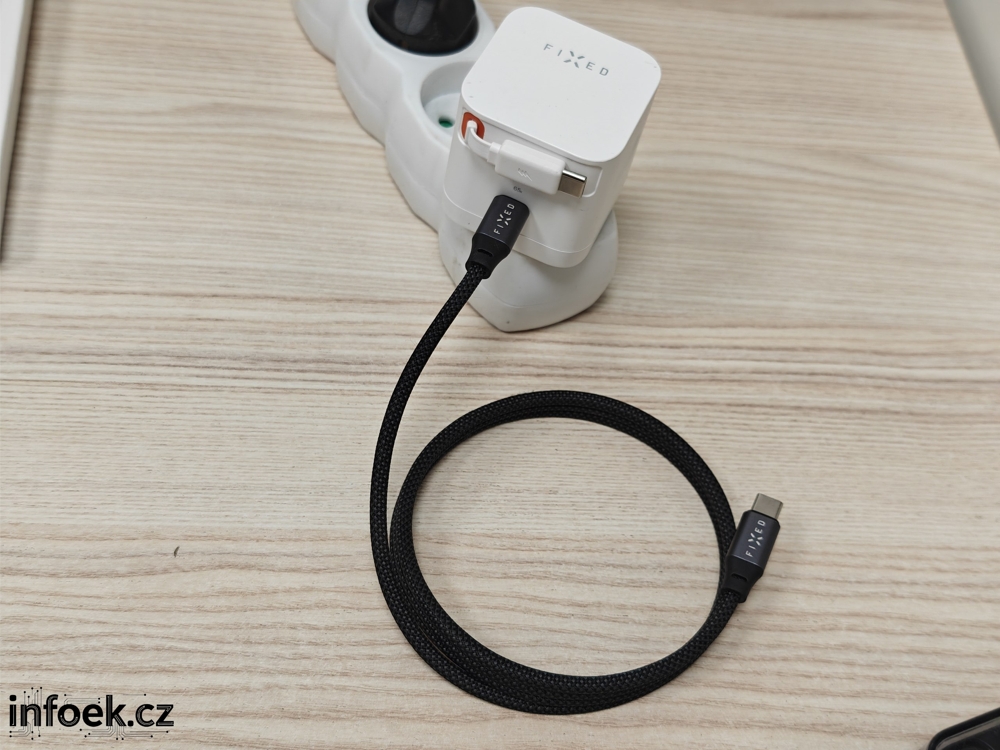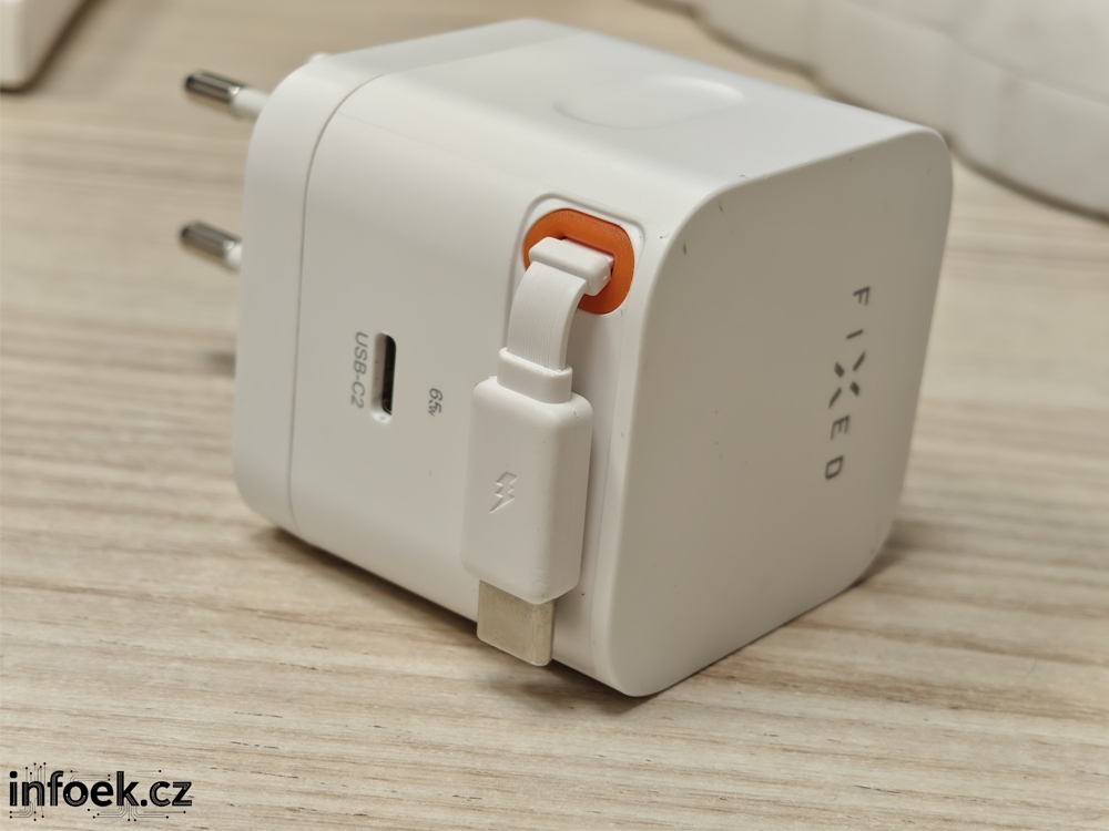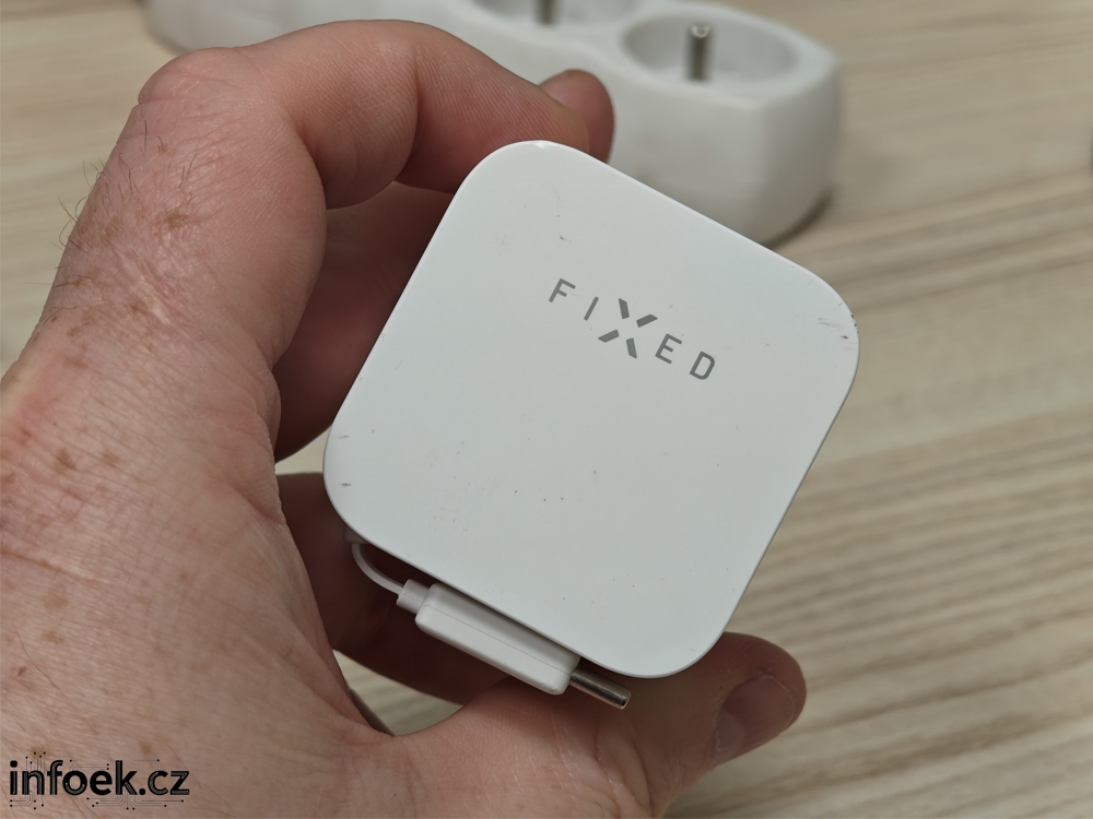 Na horní části adaptéru se nachází logo značky FIXED. Na boku je konec kabelu s konektorem USB‑C, v němž je ukryt magnet, který brání samovolnému odvíjení kabelu při přenášení. Integrovaný kabel má délku 64 cm. To mi většinou stačilo, ale občas bych ocenil spíše délku kolem 100 cm. V takových případech jsem připojil magnetický kabel FIXED a bez potíží nabíjel dvě zařízení najednou.
